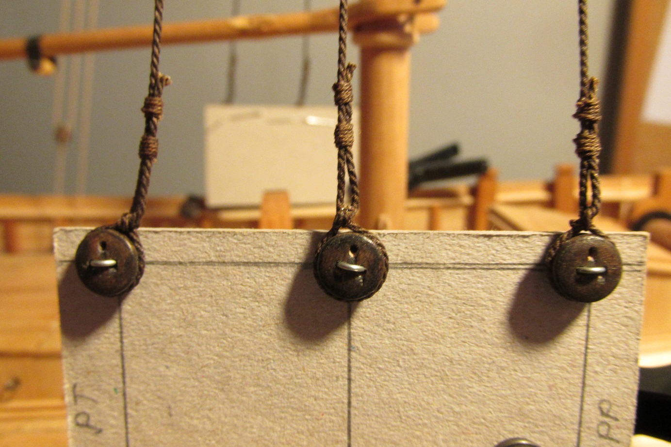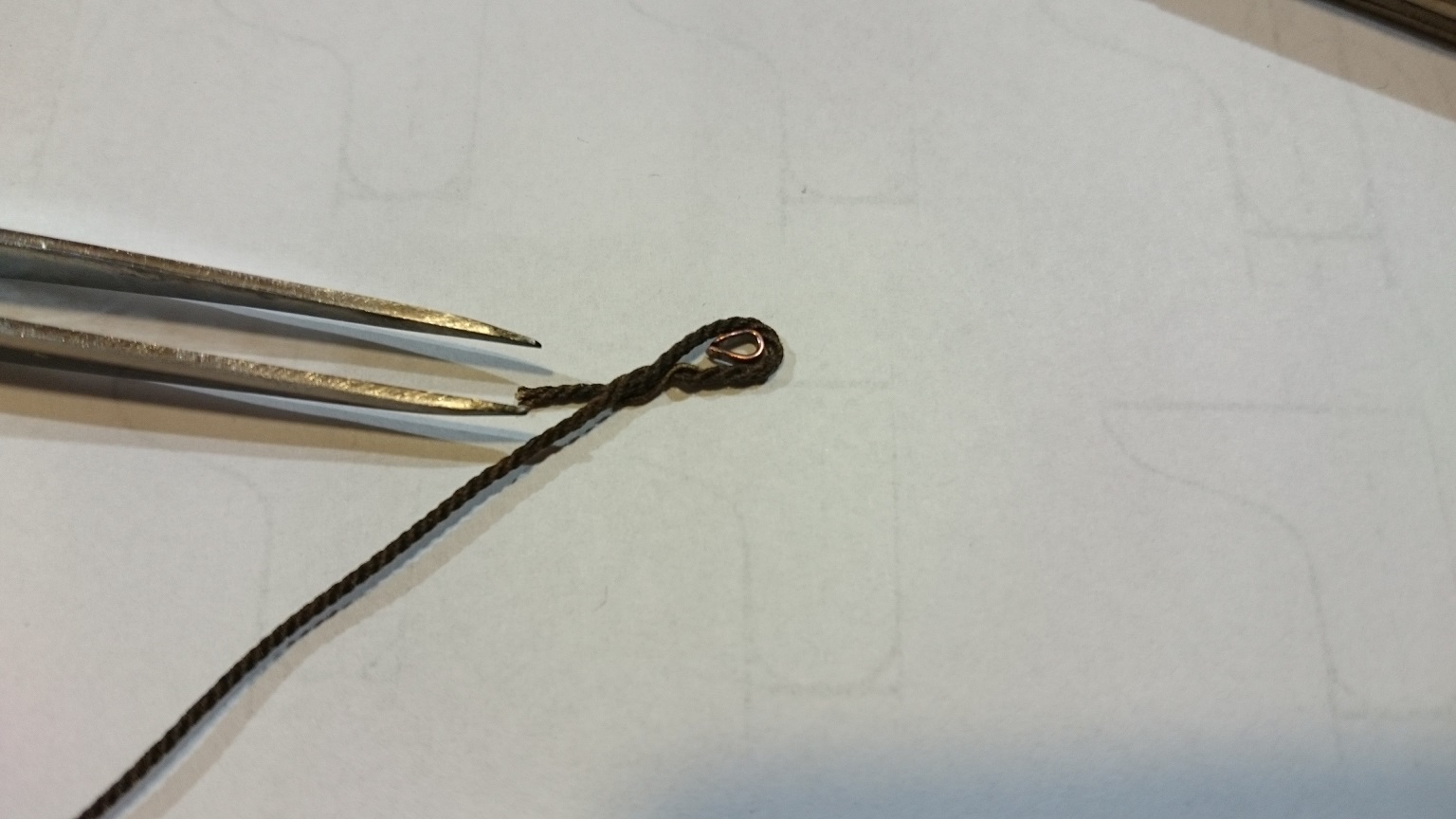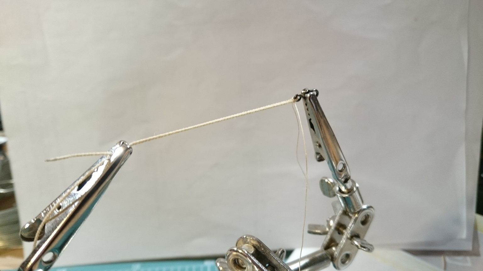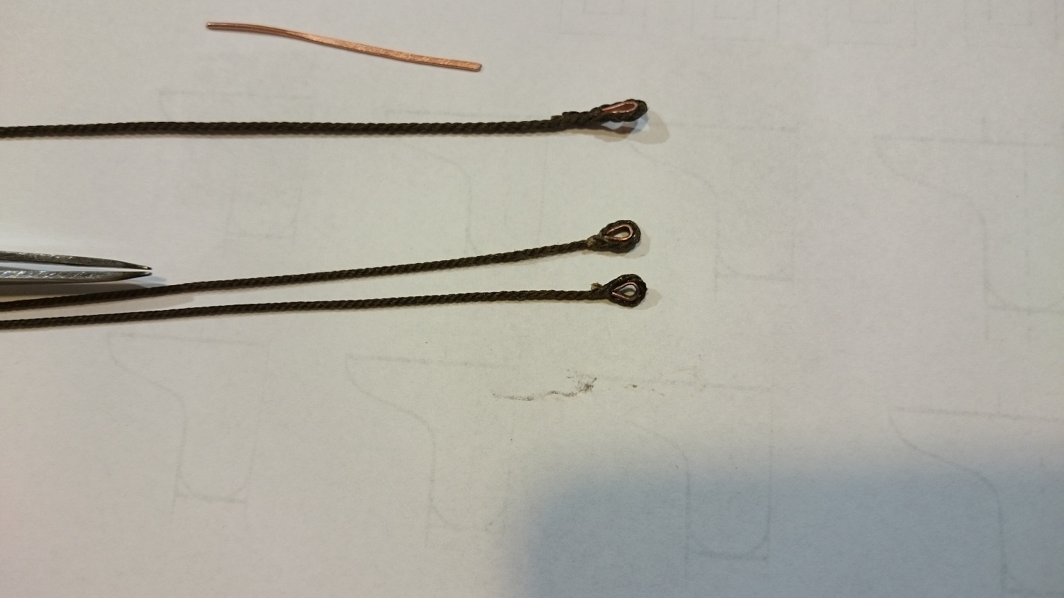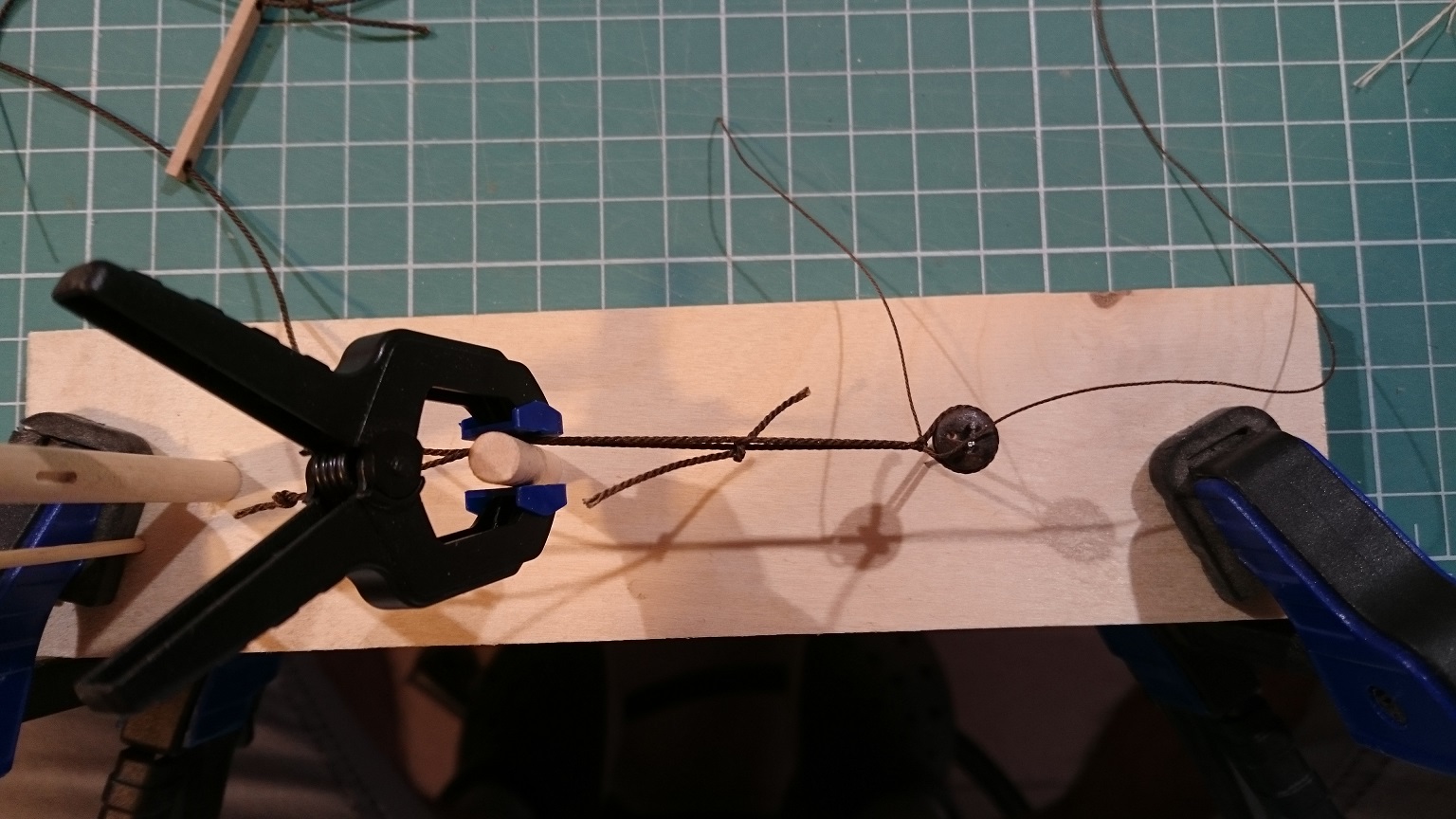 Mała aktualizacja. Siedzę przy linkach. Powiązałem wanty, wyczytałem w Monfeldzie, że kolejne po wantach powinny być wizane backsztagi. Pewnie robię mnóstwo błędów, ale moja świadomość jest na tyle jeszcze mała, że nawet wczytując się w klasyka nie wszystko do końca rozumiem. Na przykład grubość want powinna być według tabeli taka jak sztagu, ale to wyglądało by bardzo dziwnie, może jednak tak powinno być... Mam nici 12x3, liny które już ukręciłem będą: