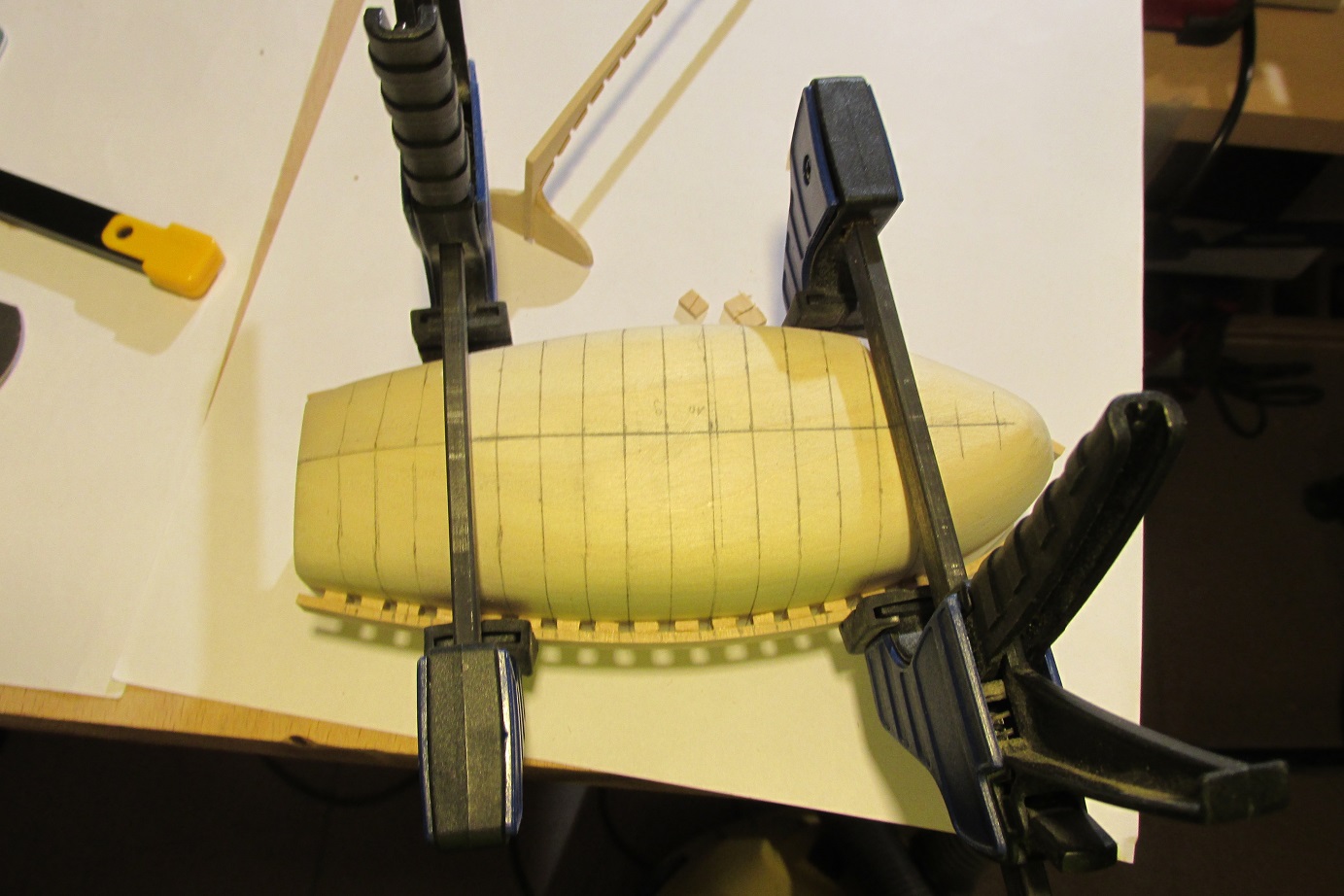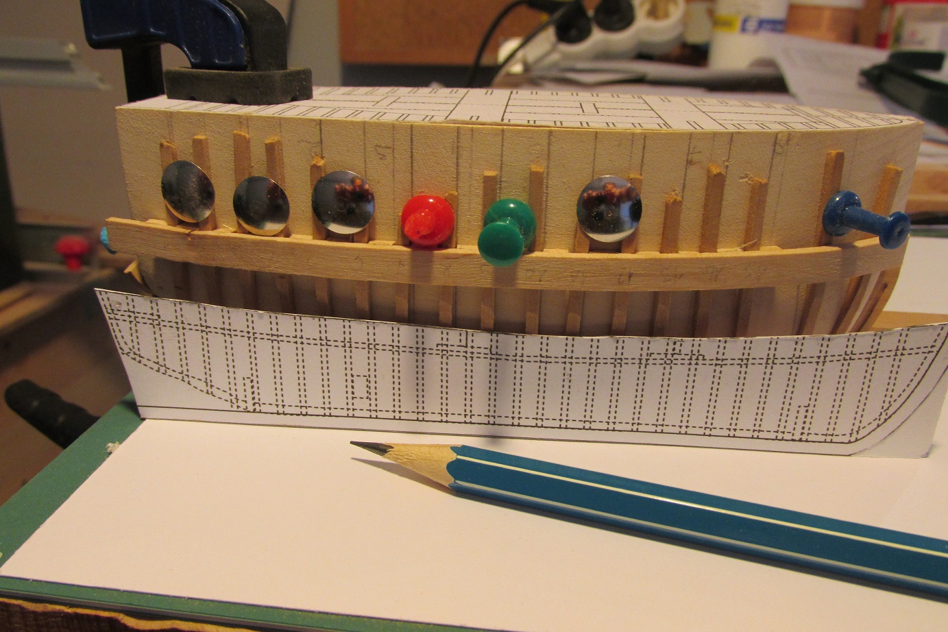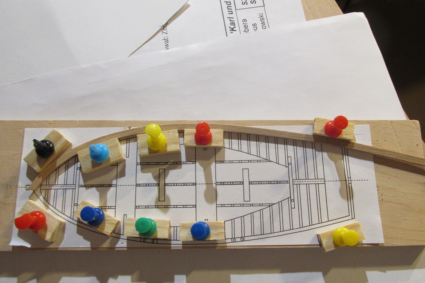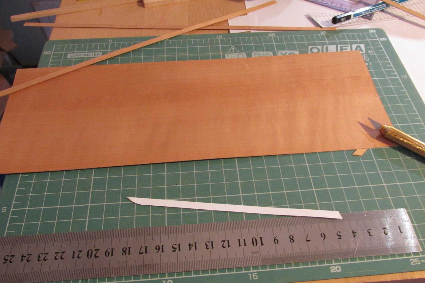 Bardzo powoli pracuję nad szalupą. Poszycie robię z forniru gruszy. Najpierw myślałem żeby docinać i szlifować listwy grubości około 0,5 mm, ale to było by sporo dodatkowej pracy, a fornir akurat mam, jest wprawdzie trochę inny kolor, ale może nie będzie wyglądać źle. Kilka fotek z postępu prac.