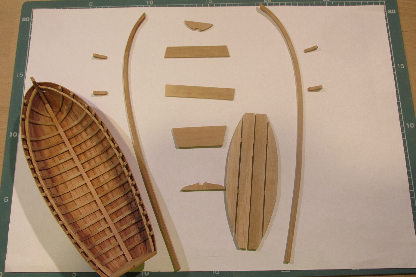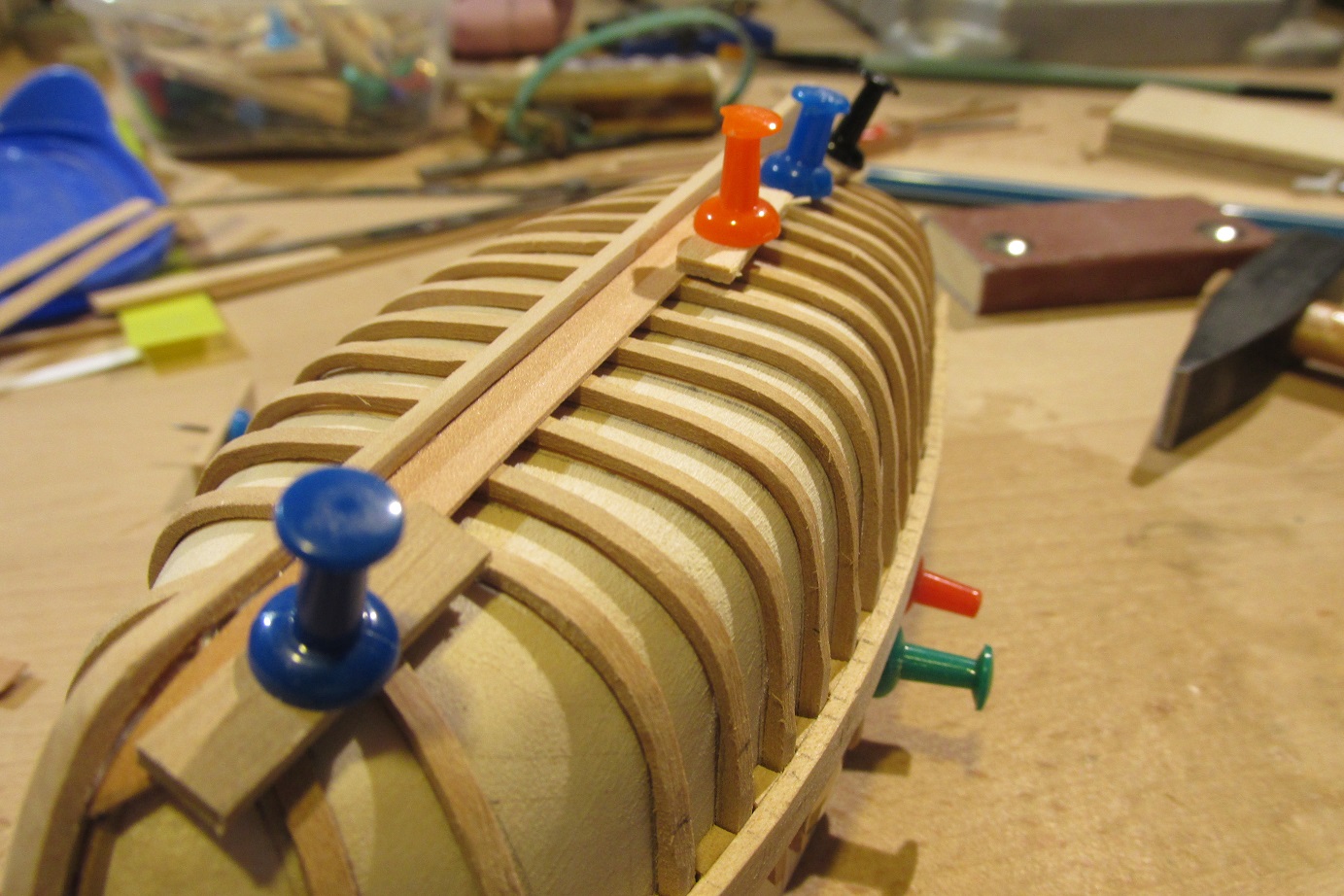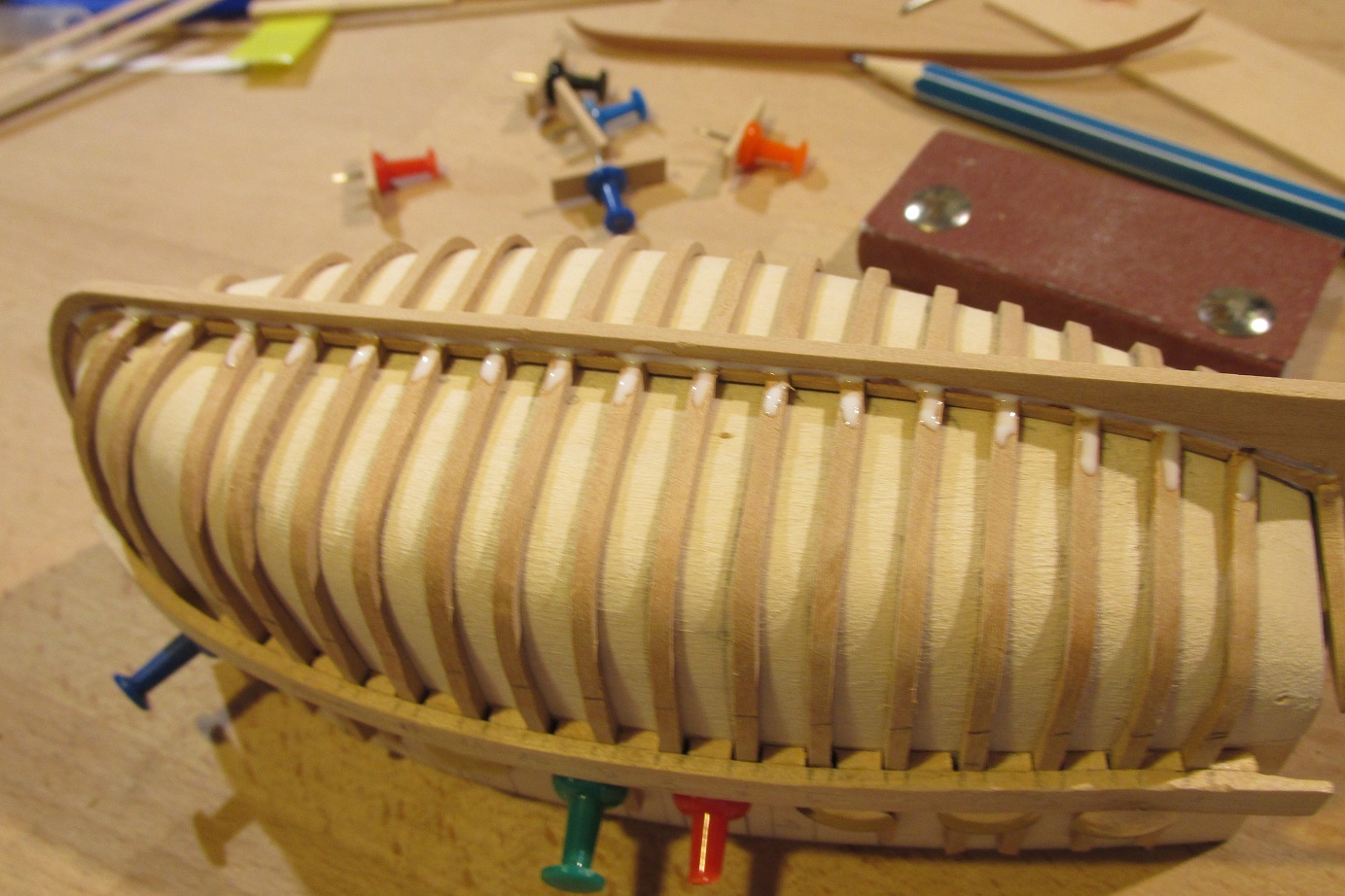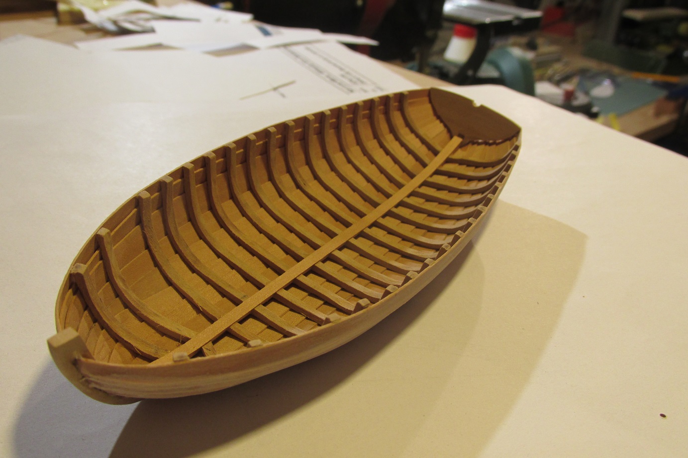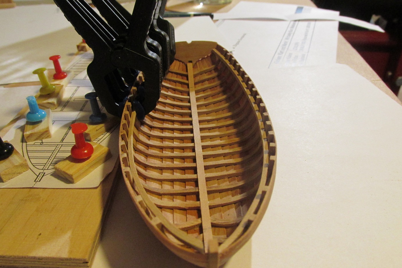 Bardzo powoli pracuję nad szalupą. Poszycie robię z forniru gruszy. Najpierw myślałem żeby docinać i szlifować listwy grubości około 0,5 mm, ale to było by sporo dodatkowej pracy, a fornir akurat mam, jest wprawdzie trochę inny kolor, ale może nie będzie wyglądać źle. Kilka fotek z postępu prac.