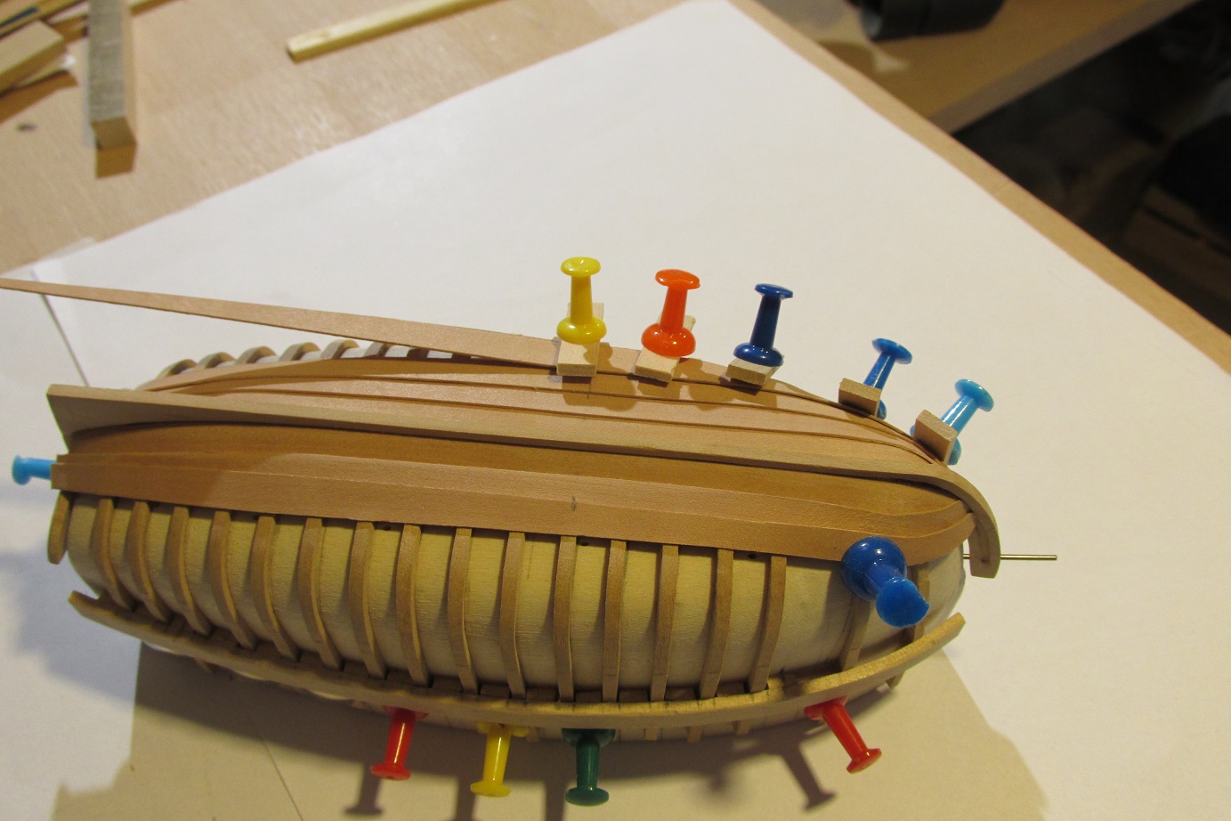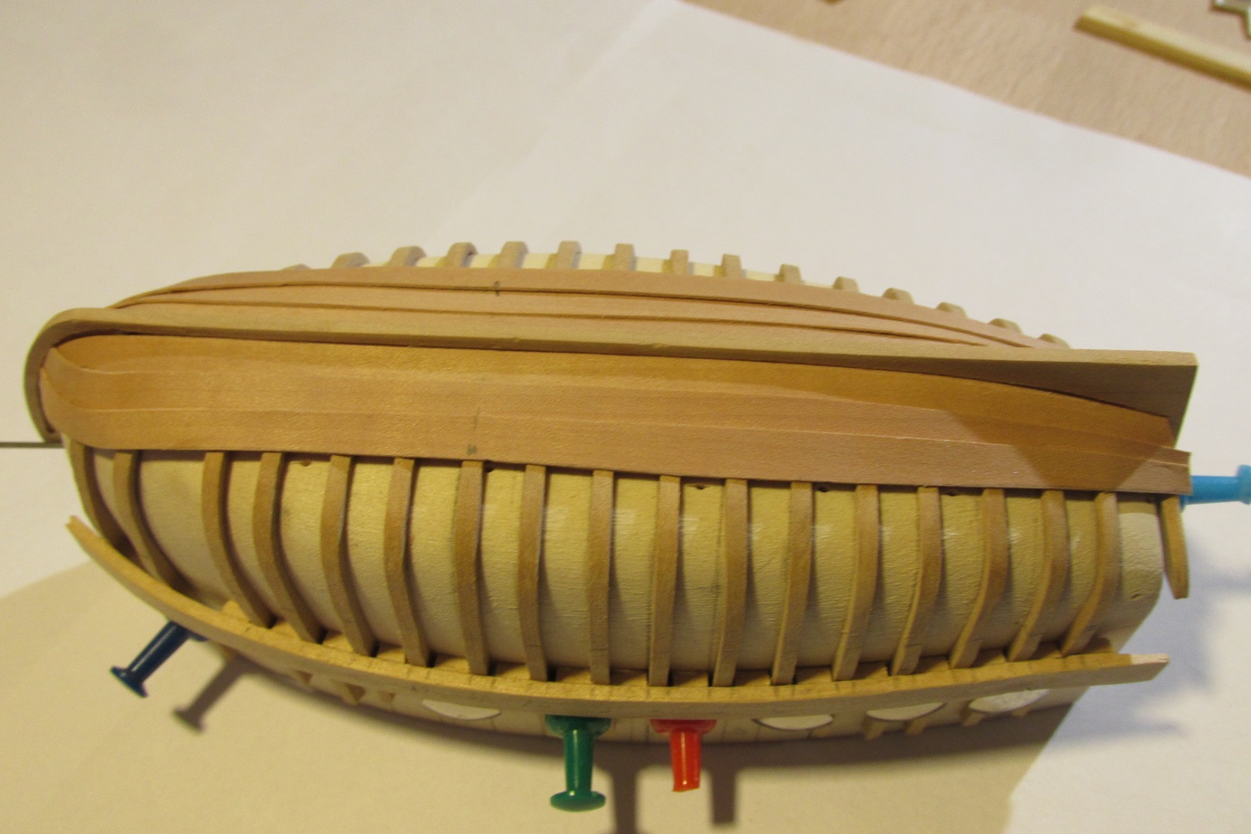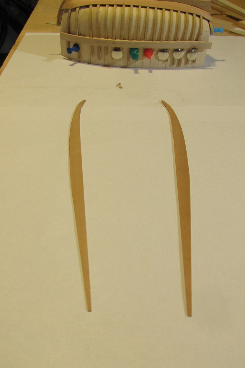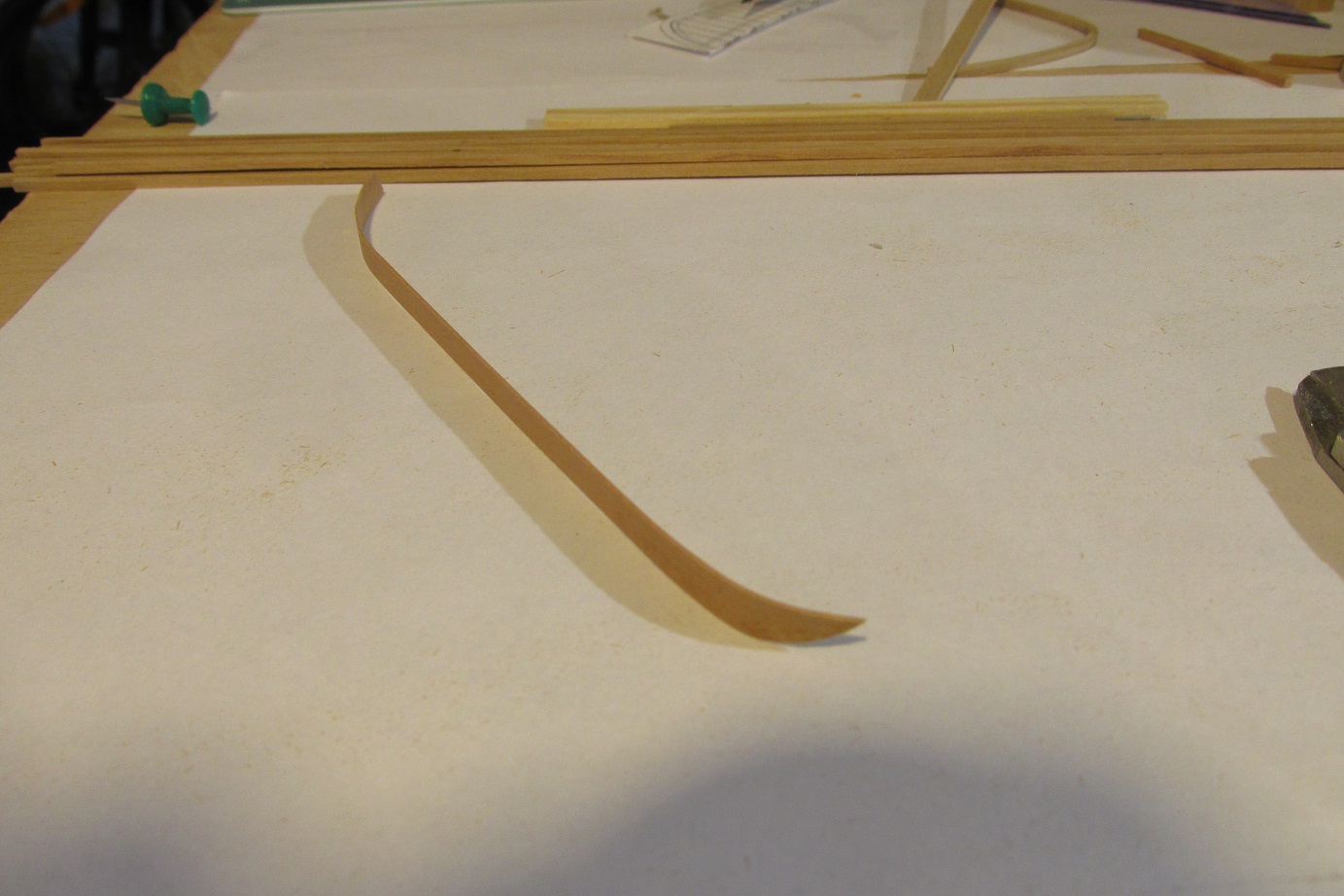 Bardzo powoli pracuję nad szalupą. Poszycie robię z forniru gruszy. Najpierw myślałem żeby docinać i szlifować listwy grubości około 0,5 mm, ale to było by sporo dodatkowej pracy, a fornir akurat mam, jest wprawdzie trochę inny kolor, ale może nie będzie wyglądać źle. Kilka fotek z postępu prac.
