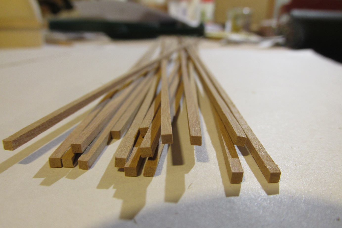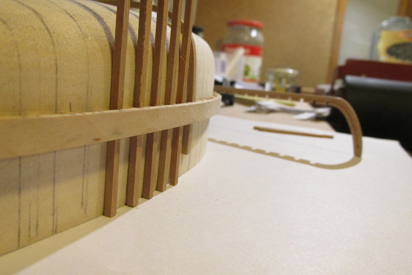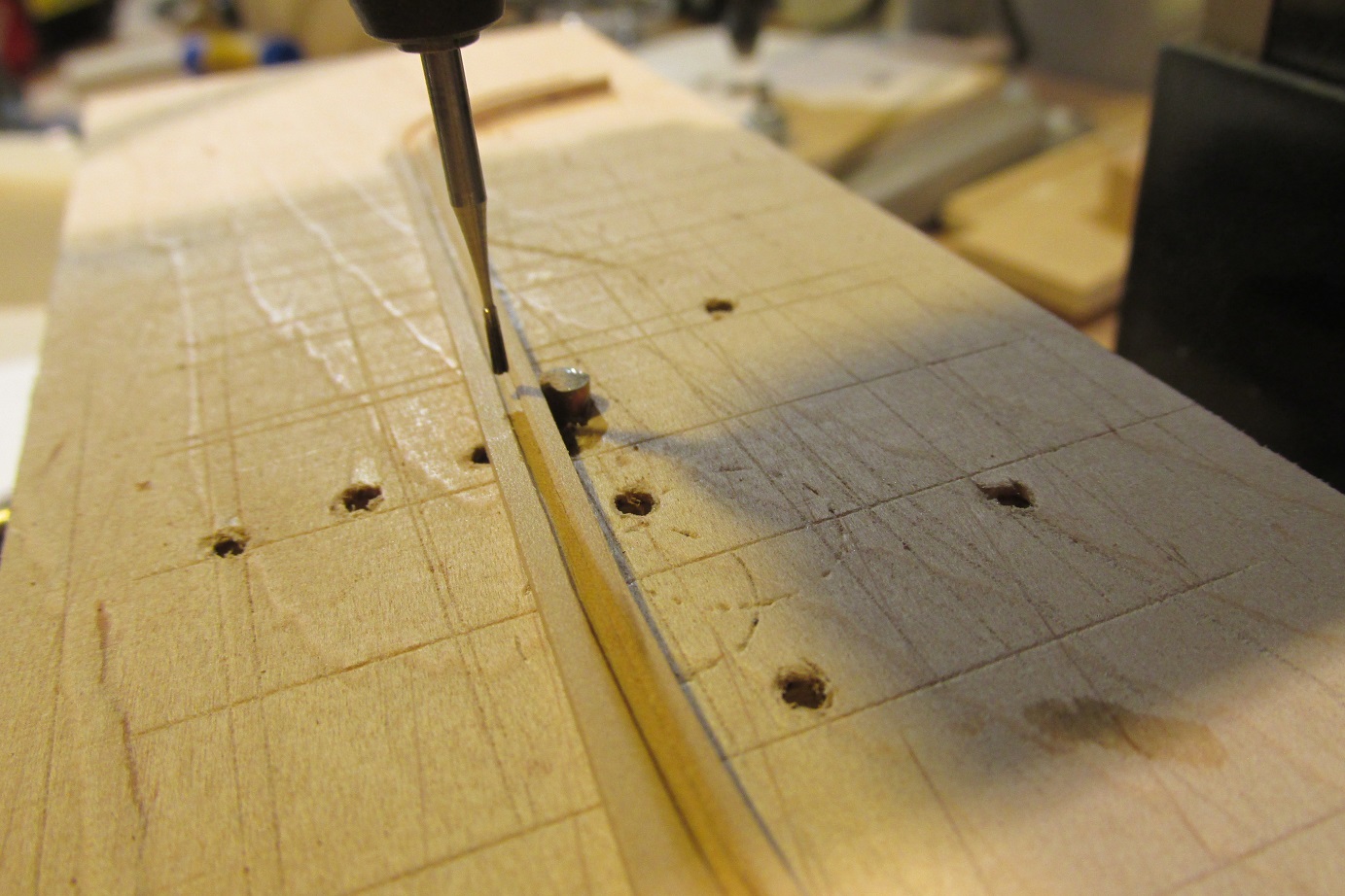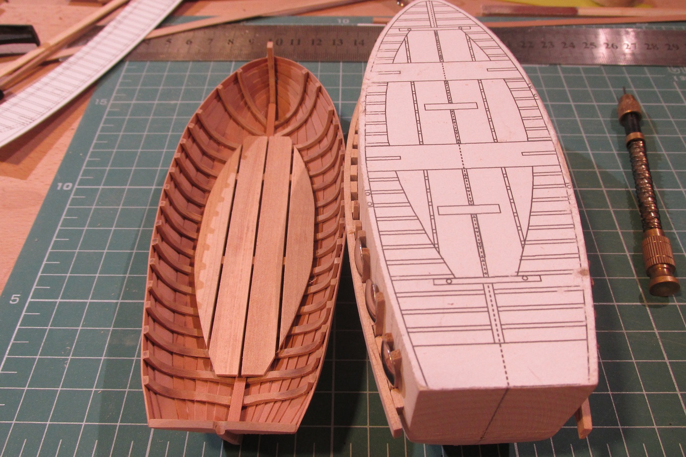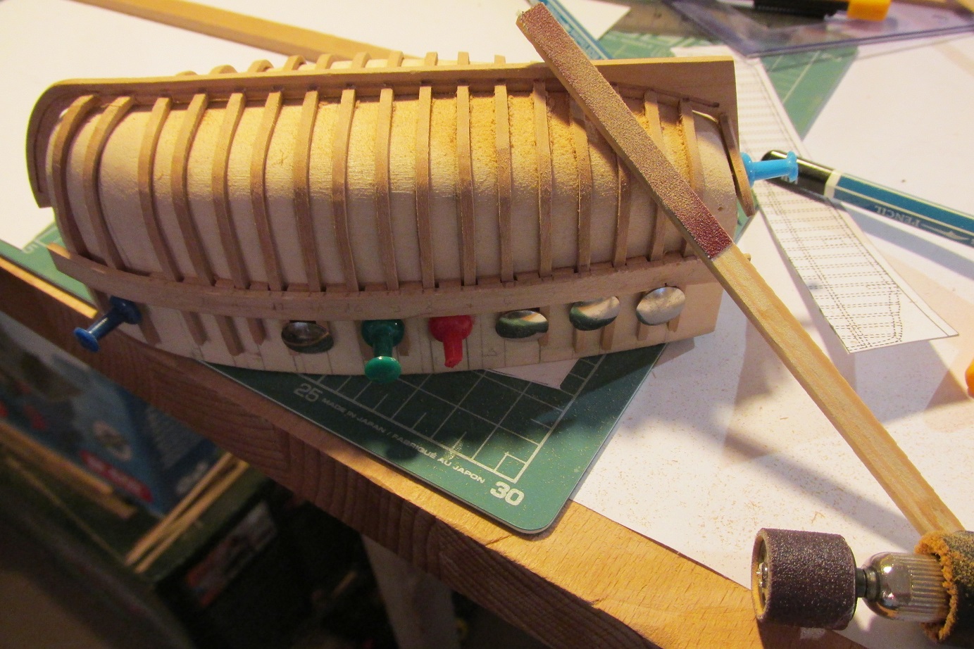 Bardzo powoli pracuję nad szalupą. Poszycie robię z forniru gruszy. Najpierw myślałem żeby docinać i szlifować listwy grubości około 0,5 mm, ale to było by sporo dodatkowej pracy, a fornir akurat mam, jest wprawdzie trochę inny kolor, ale może nie będzie wyglądać źle. Kilka fotek z postępu prac.