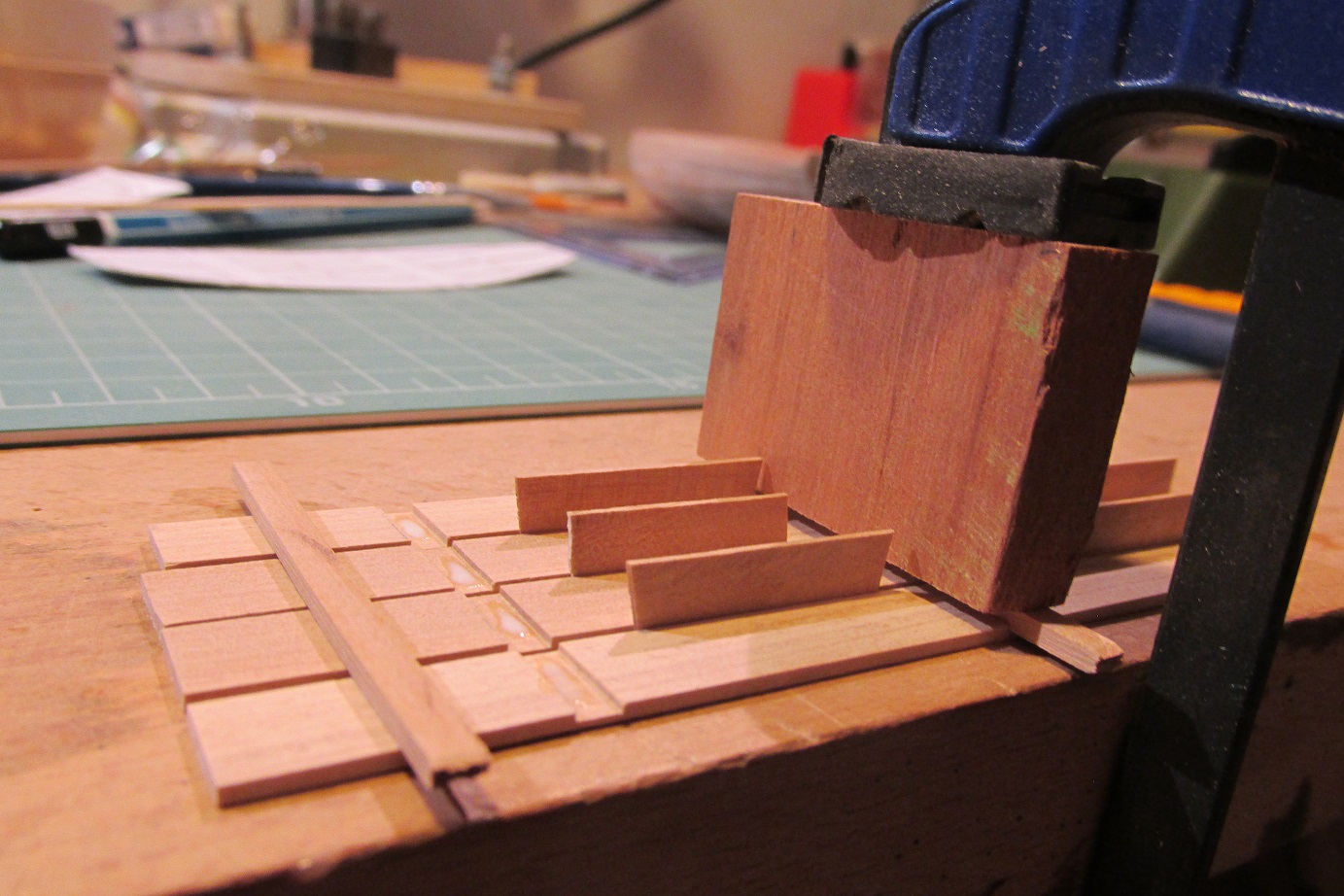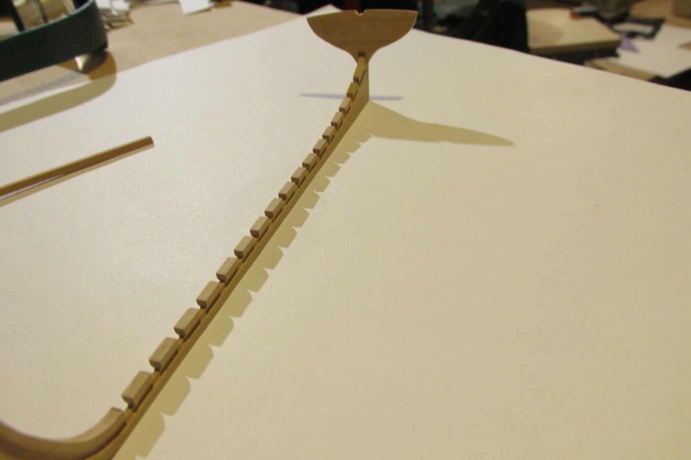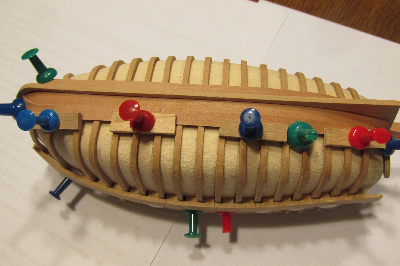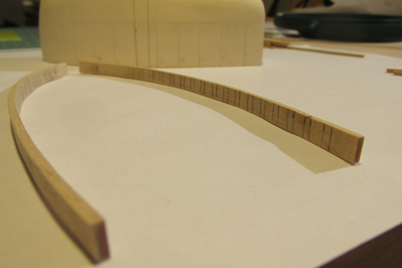 Bardzo powoli pracuję nad szalupą. Poszycie robię z forniru gruszy. Najpierw myślałem żeby docinać i szlifować listwy grubości około 0,5 mm, ale to było by sporo dodatkowej pracy, a fornir akurat mam, jest wprawdzie trochę inny kolor, ale może nie będzie wyglądać źle. Kilka fotek z postępu prac.