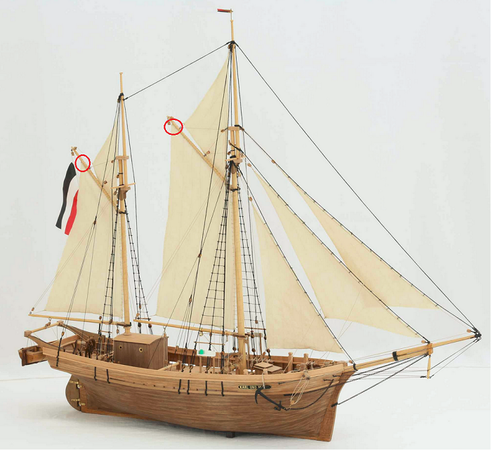 ), ale chciałbym zapytać o żagle, zwłaszcza tych kolegów, którzy budowali ten model. Czy żagle w zaznaczonych czerwonymi elipsami miejscach na poniższym zdjęciu, są mocowane do rej na sztywno? Nie mogę tego dojrzeć na żadnym ze zdjęć. Logika podpowiadałaby że tak, ale pewności nie mam.