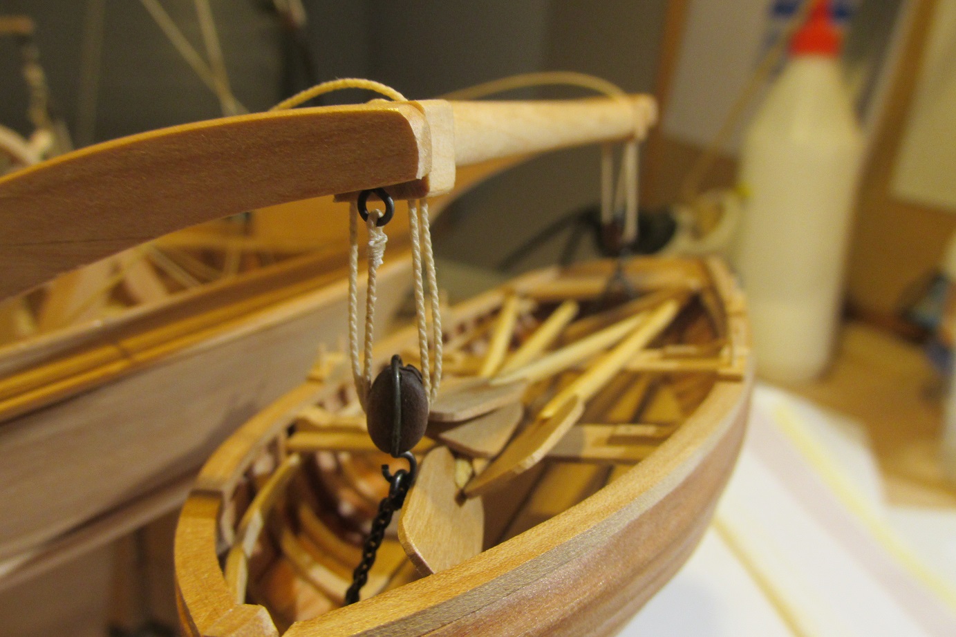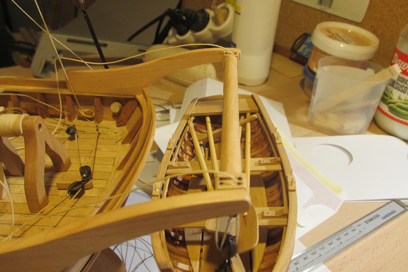 Rafał, na szalupach wiosłowych ster był ściągnięty jeśli szalupa była na pokładzie lub podwieszona na żurawikach. Choć nie wiem jak to się chce robić współczesnym żeglarzom. No i pasuje na sterze delikatnie skalpelem nanieś linie podziału płetwy steru i będzie bardziej super:)