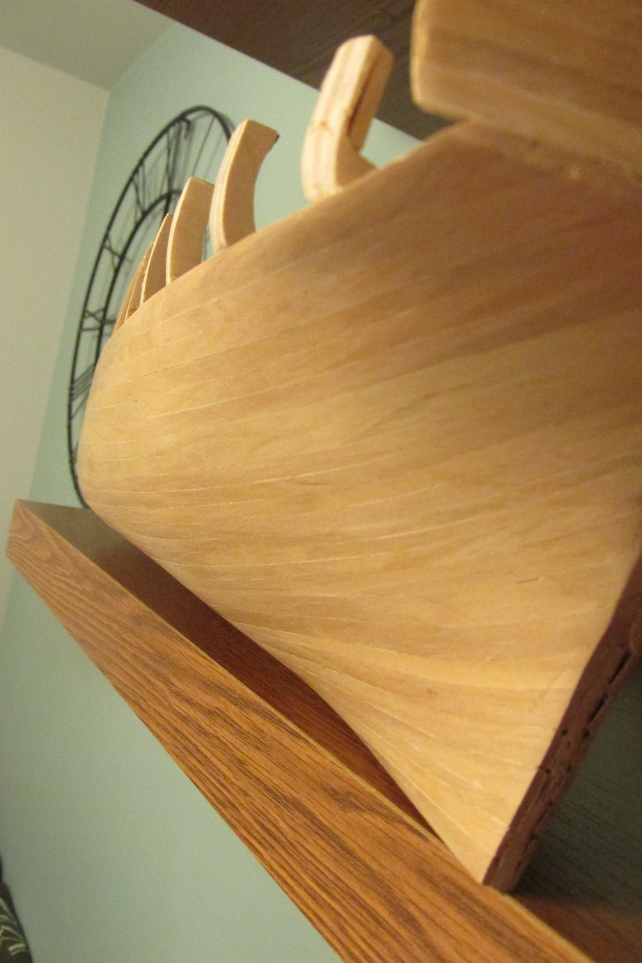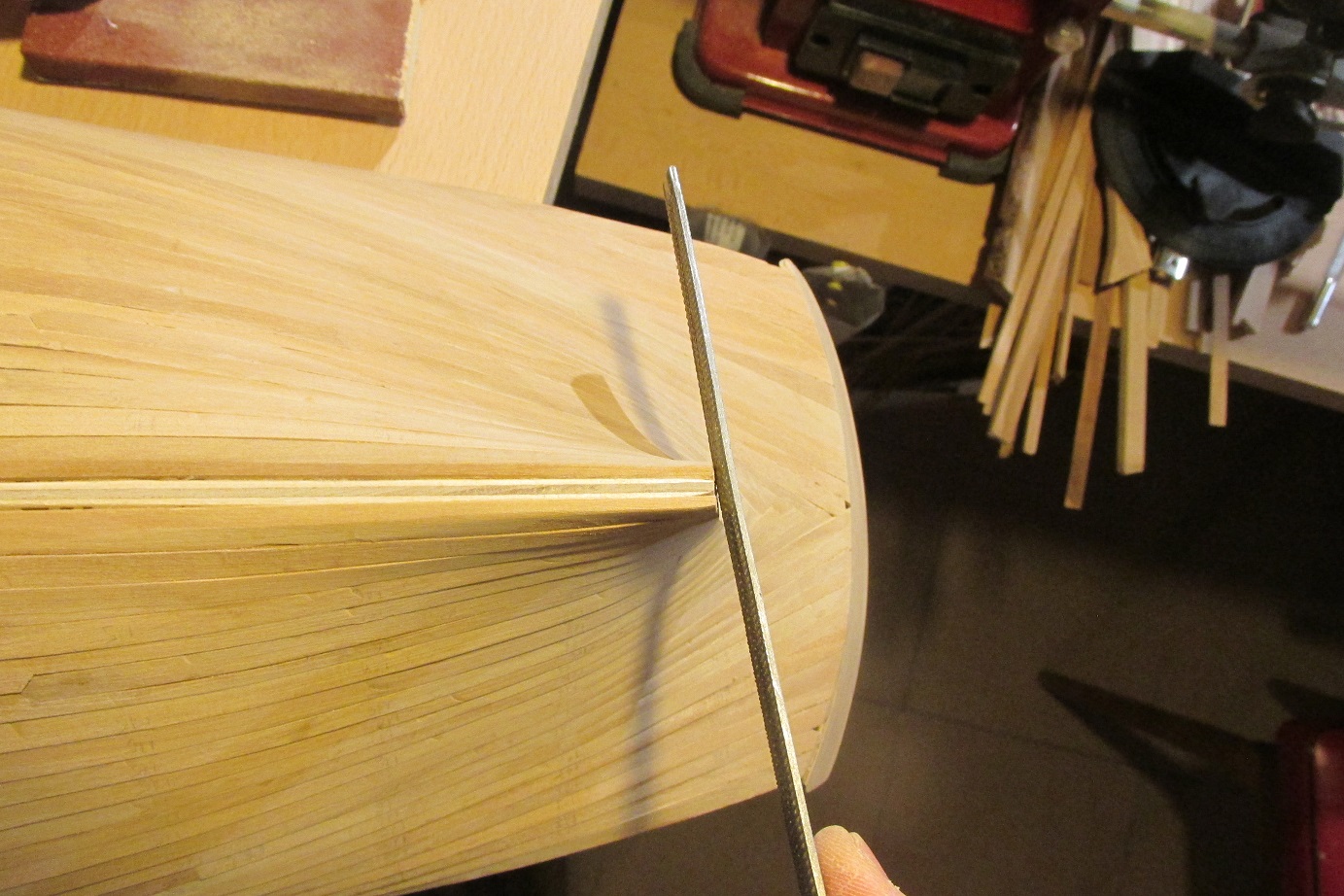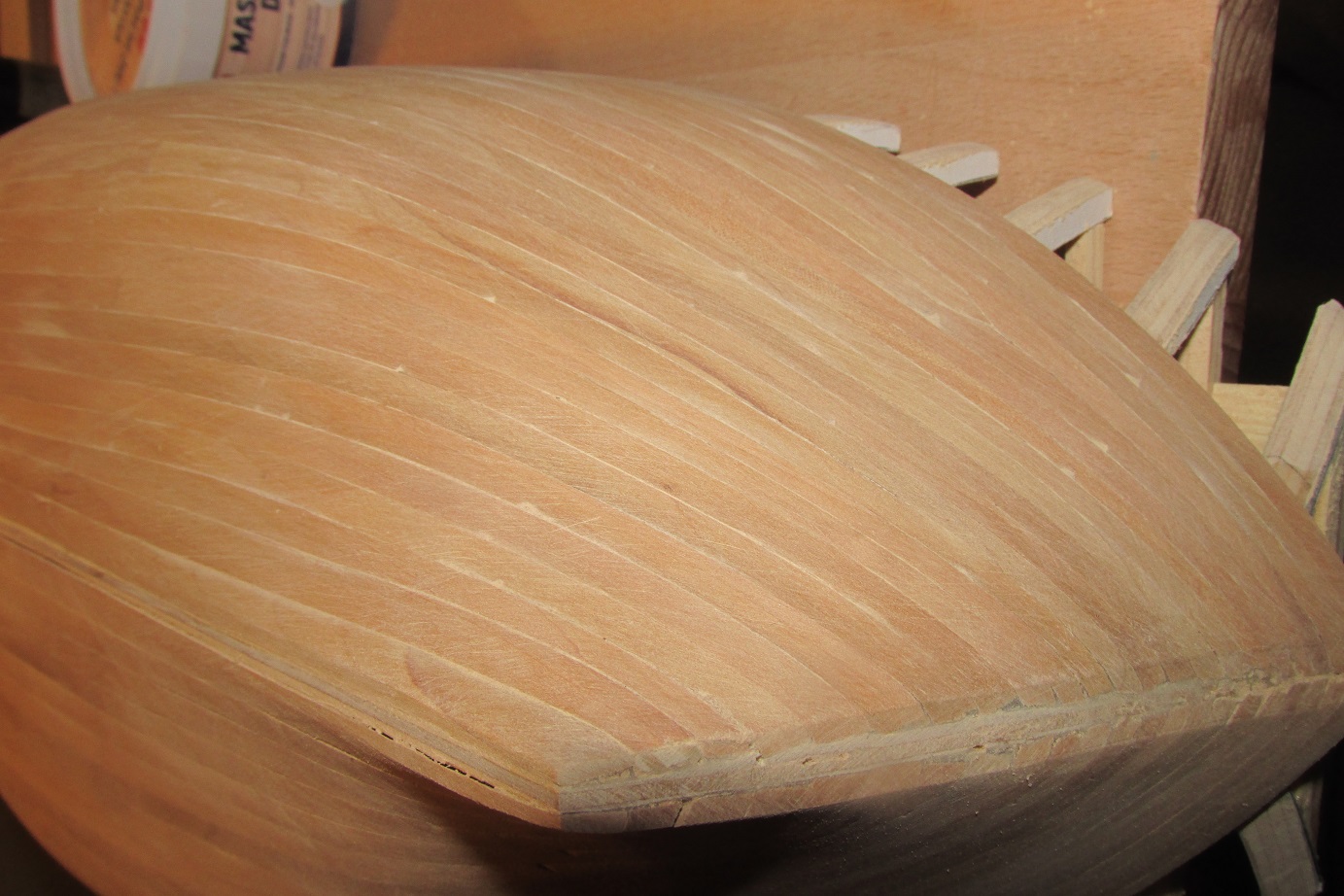 Nastąpił przełom, skończyłem wreszcie poszywanie :-) Mam nadzieję, że teraz pomimo braku czasu zacznie się dziać więcej. Dla tych, którzy zabierają się za poszywanie po raz pierwszy, tak jak ja, przestroga: z pinezkami trzeba ostrożnie. Ja trochę narobiłem wgnieceń, następnym razem będę używał podkładek z miękkiego drewna (jeśli będzie następny raz :-)). Druga rzecz to łączenie planek po długości w jednym rzędzie, tam też zabrakło mi uwagi. Po trzecie podczas dopasowywania planek, lepiej użyć tylko hebelka a papieru tylko do wyrównania. W miejscach gdzie próbowałem formować papierem, listwy nie są idealnie spasowane. Czyli nie jest łatwo robić pierwszy model :-) Ale na tym polega nauka :-)
