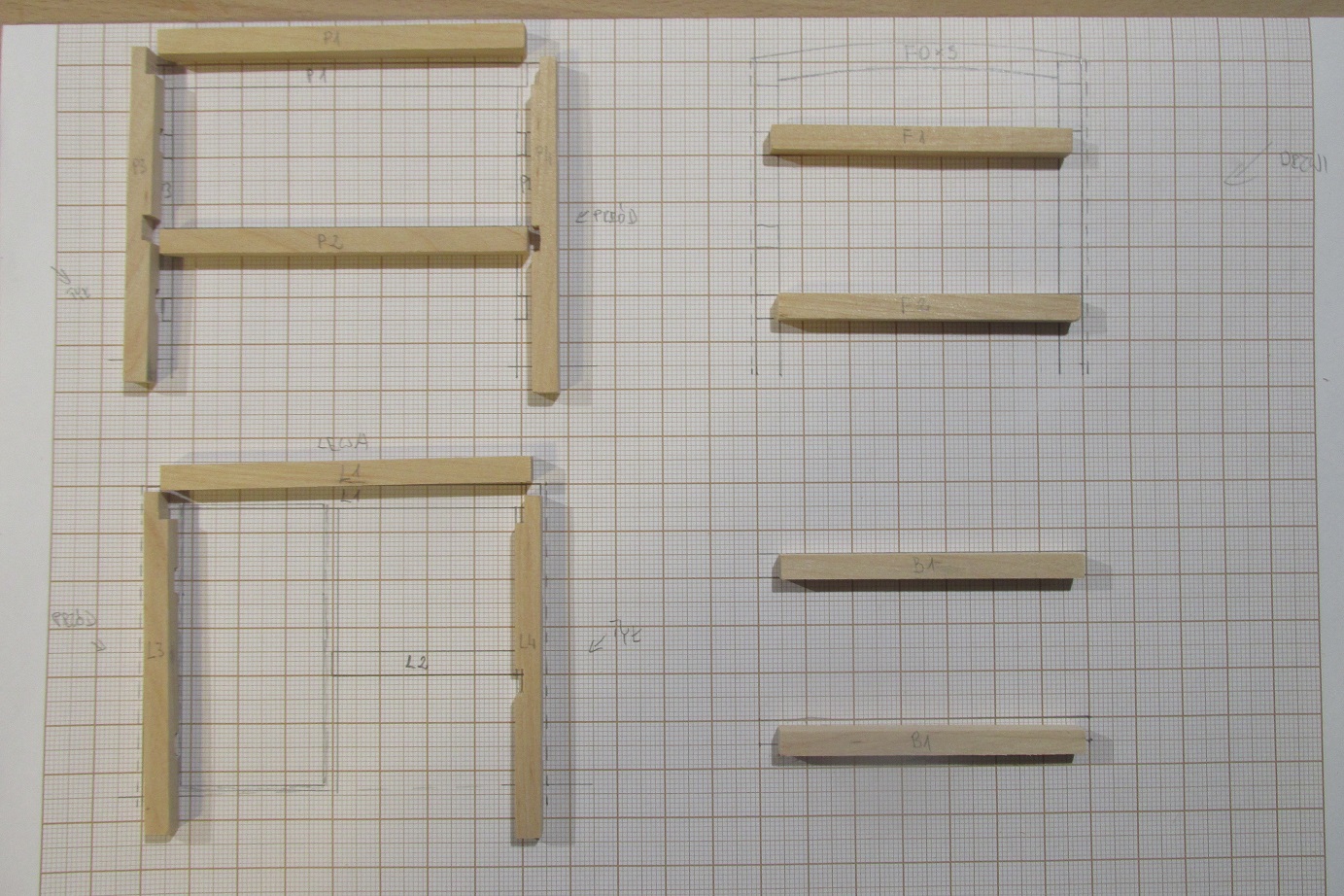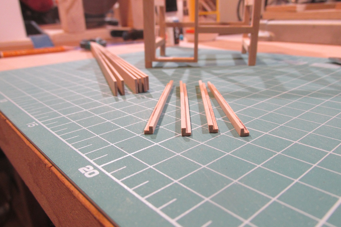 Rozpocząłem jak zwykle od przygotowania materiału i jak zwykle przygotowałem go za mało :-) Narożniki 3x3 mm frezowane na FET-cie i listewki 8x1 mm, wszystko z gruszy.