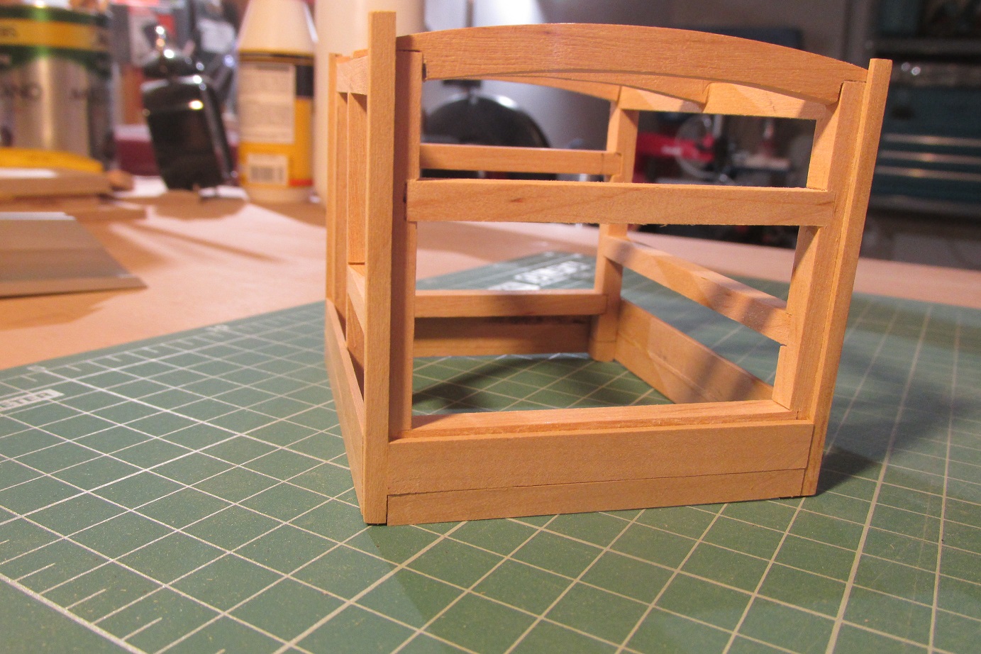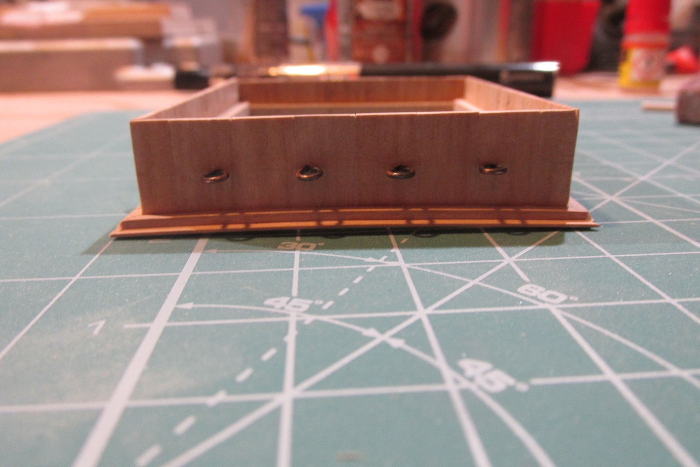 Poszywanie zacząłem od wklejenia narożników i listew poziomych zostawiając miejsce na listwy poziome przy pokładzie.
