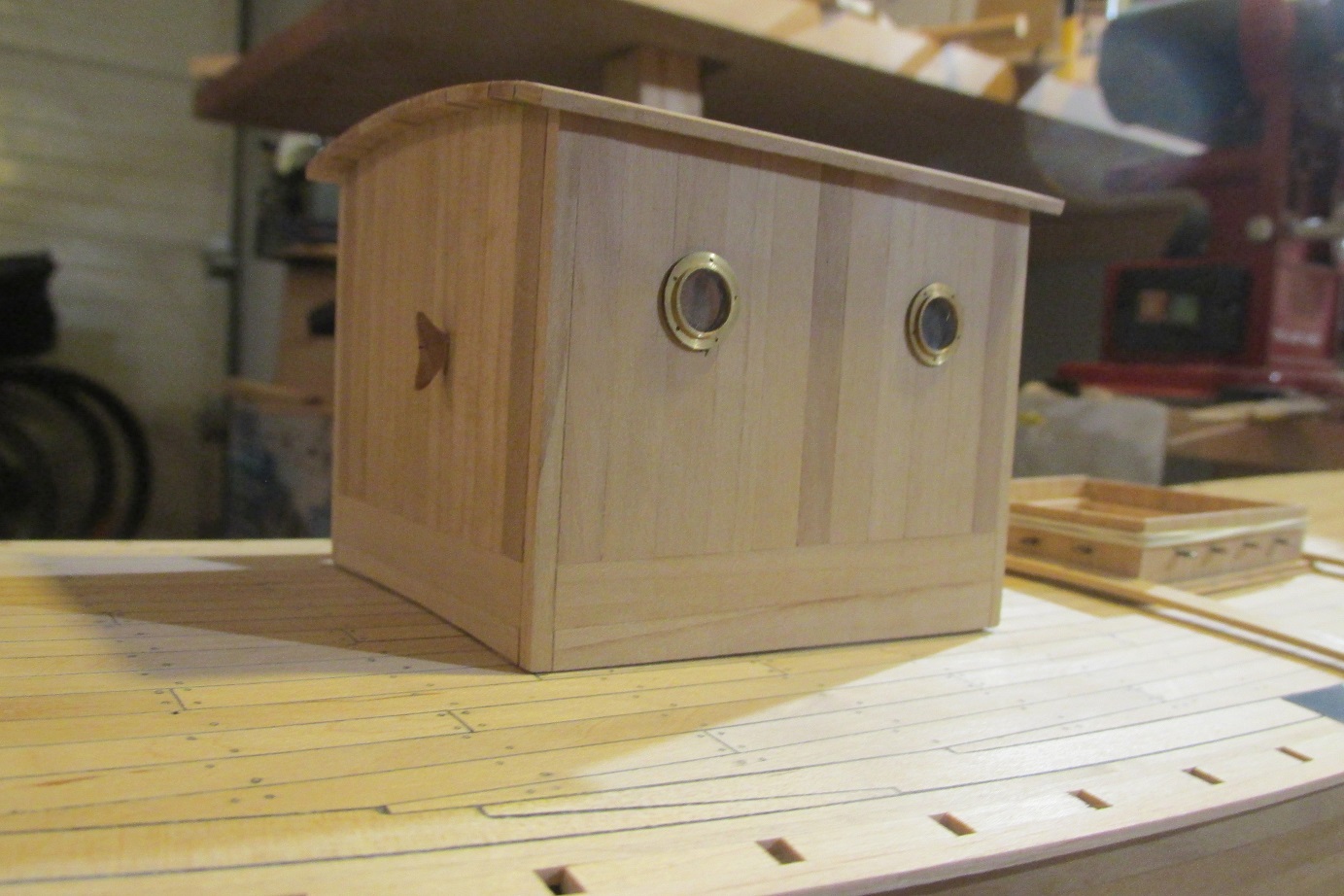 Pracuję cały czas nad nadbudówką oraz walczę z próbami obróbki blachy, ponieważ muszę zrobić zawiasy i okucia do drzwi nadbudówki. Nadbudówka jest poszywana listewkami z gruszy, muszę przyznać, że to drewno znów mnie urzekło :-)