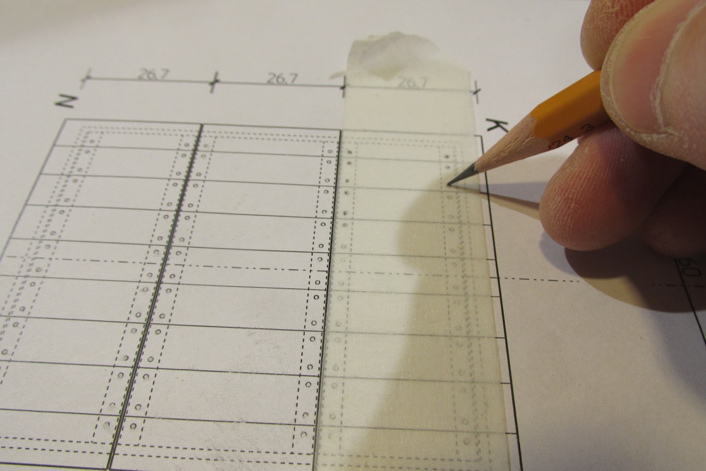 Aby równo wykonać wiercenie pod kołki, zdjąłem z planów ich położenie na taśmę.