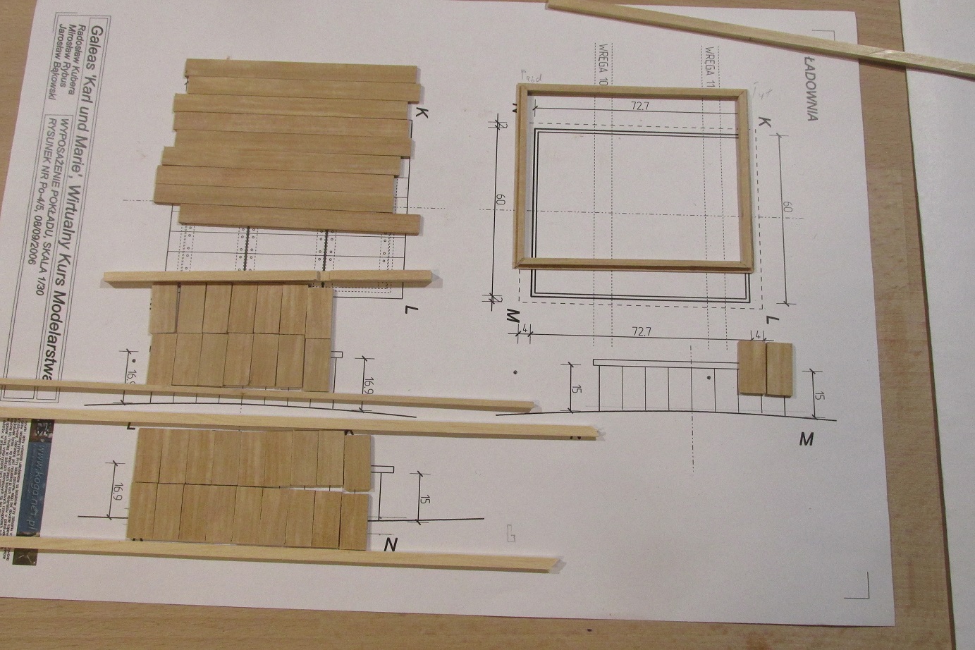 Tak zapalczywie kołkowałem, że złamało mi się wiertło 0,5 mm :-) a ponieważ nie mam zapasowego, to oczywiście zamówiłem i w trakcie czekania zabrałem się za nadbudówkę. Nadbudówka będzie na konstrukcji z listew 5x5 mm. Nie jest to najłatwiejszy sposób, ale żeby się nauczyć trzeba robić i się uczyć :-) Zapraszam do fotek.