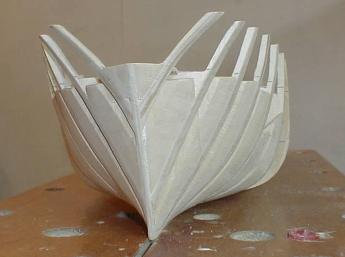wypełnianie klockami topolowymi przestrzeni pomiędzy wręgami dziobowymi i rufowymi