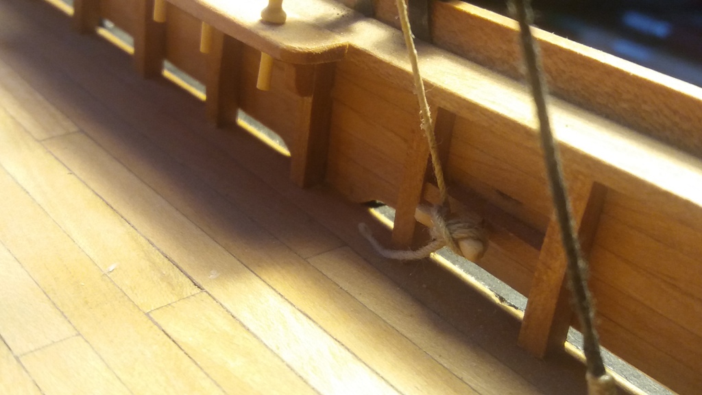 niestety, po skończonej robocie zorientowałem się, że linki padunów powinny być zawiązane knagach a nie na naglach; poniżej zdjęcia z poprawionego wiązania linek padunów do knag
