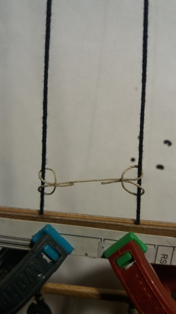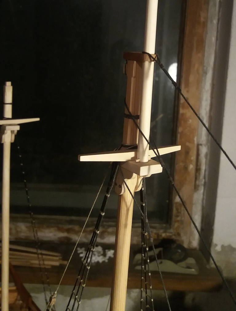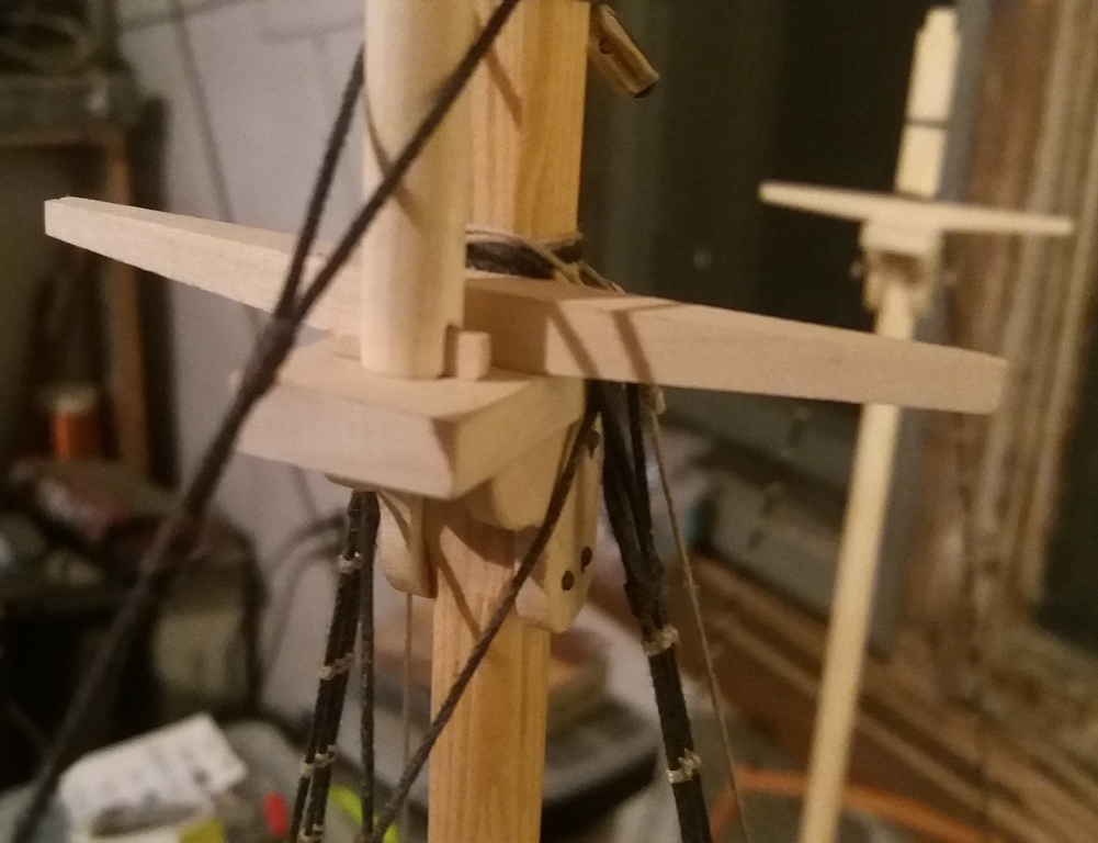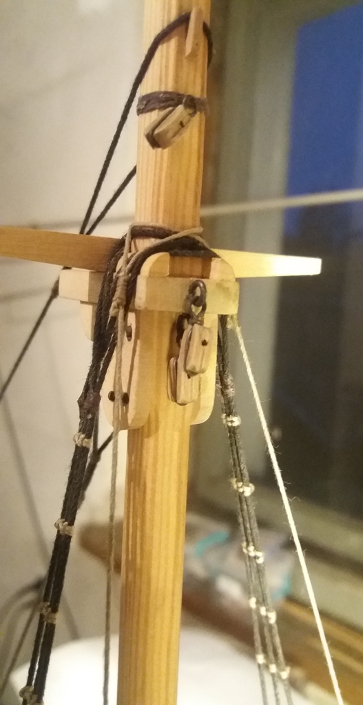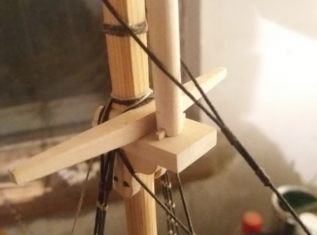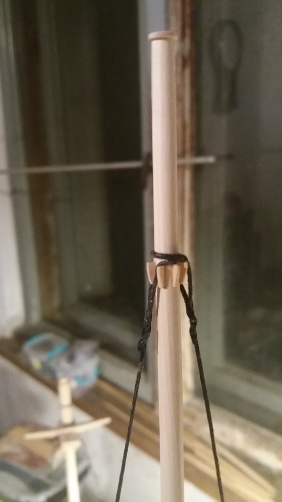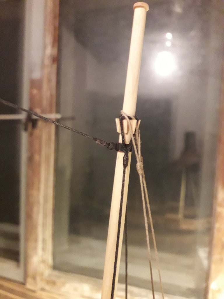 Wiązanie wyblinek ukończone. Obecnie przeniosłem się na grotmaszt i zamocowałem grot stengę.