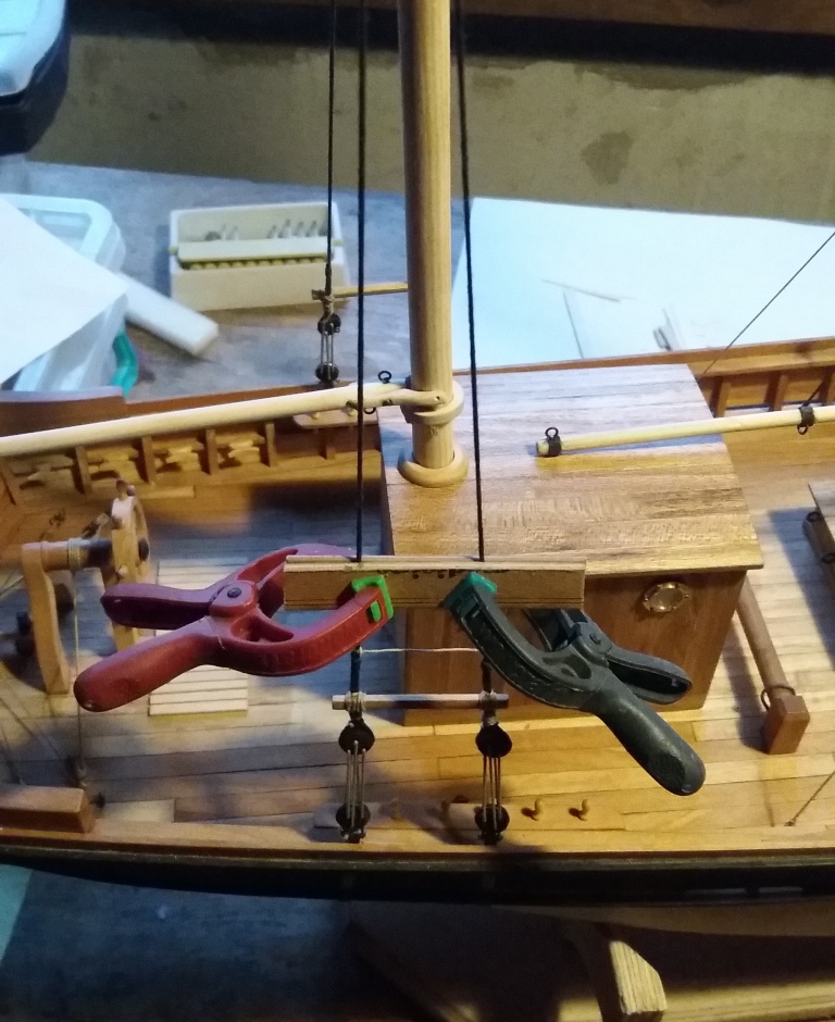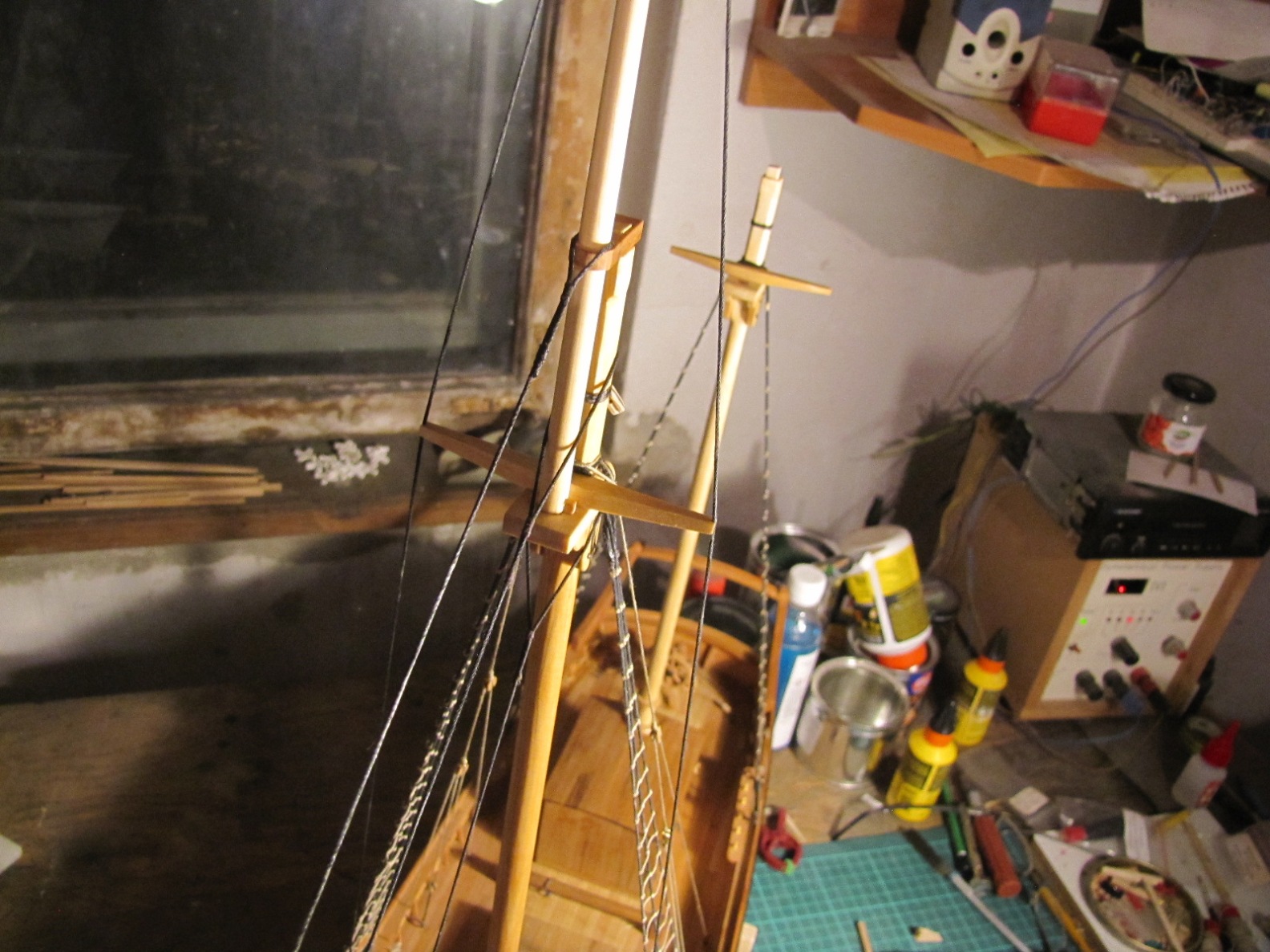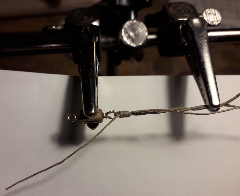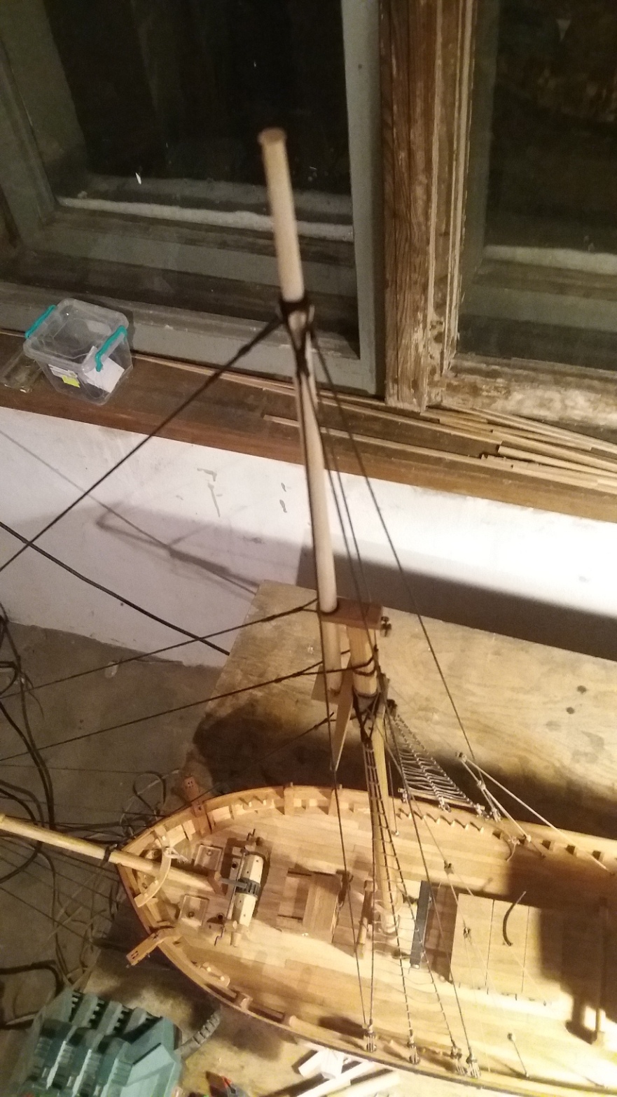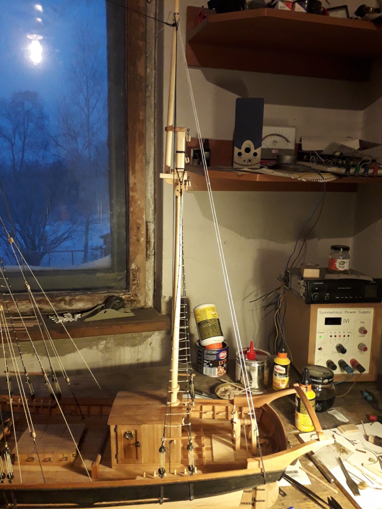 Wiązanie wyblinek ukończone. Obecnie przeniosłem się na grotmaszt i zamocowałem grot stengę.