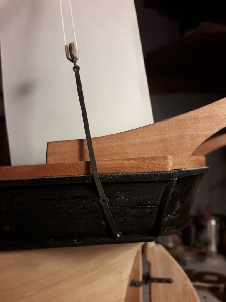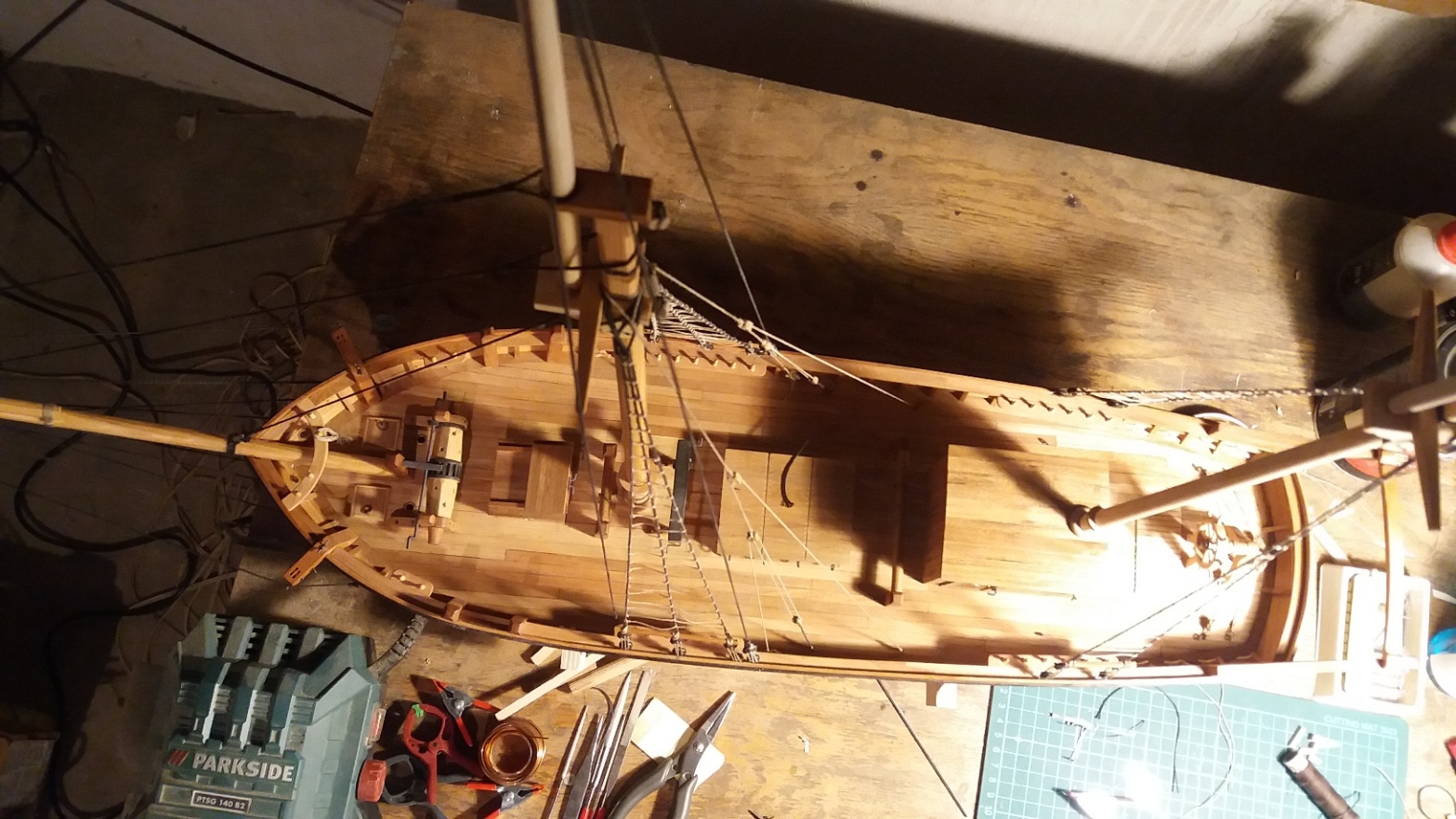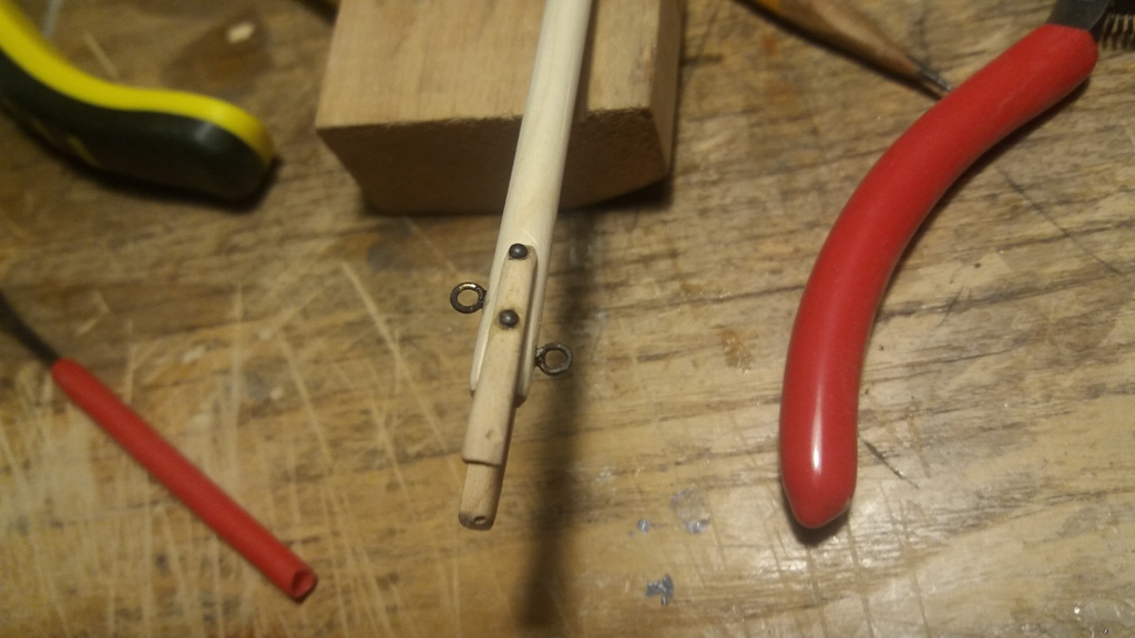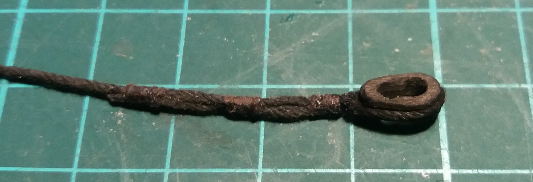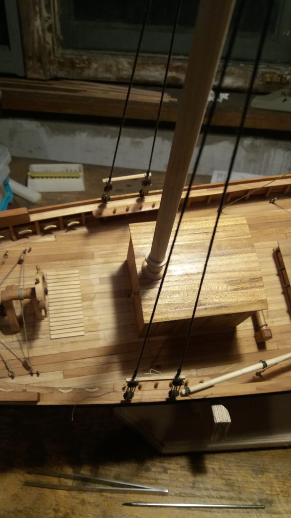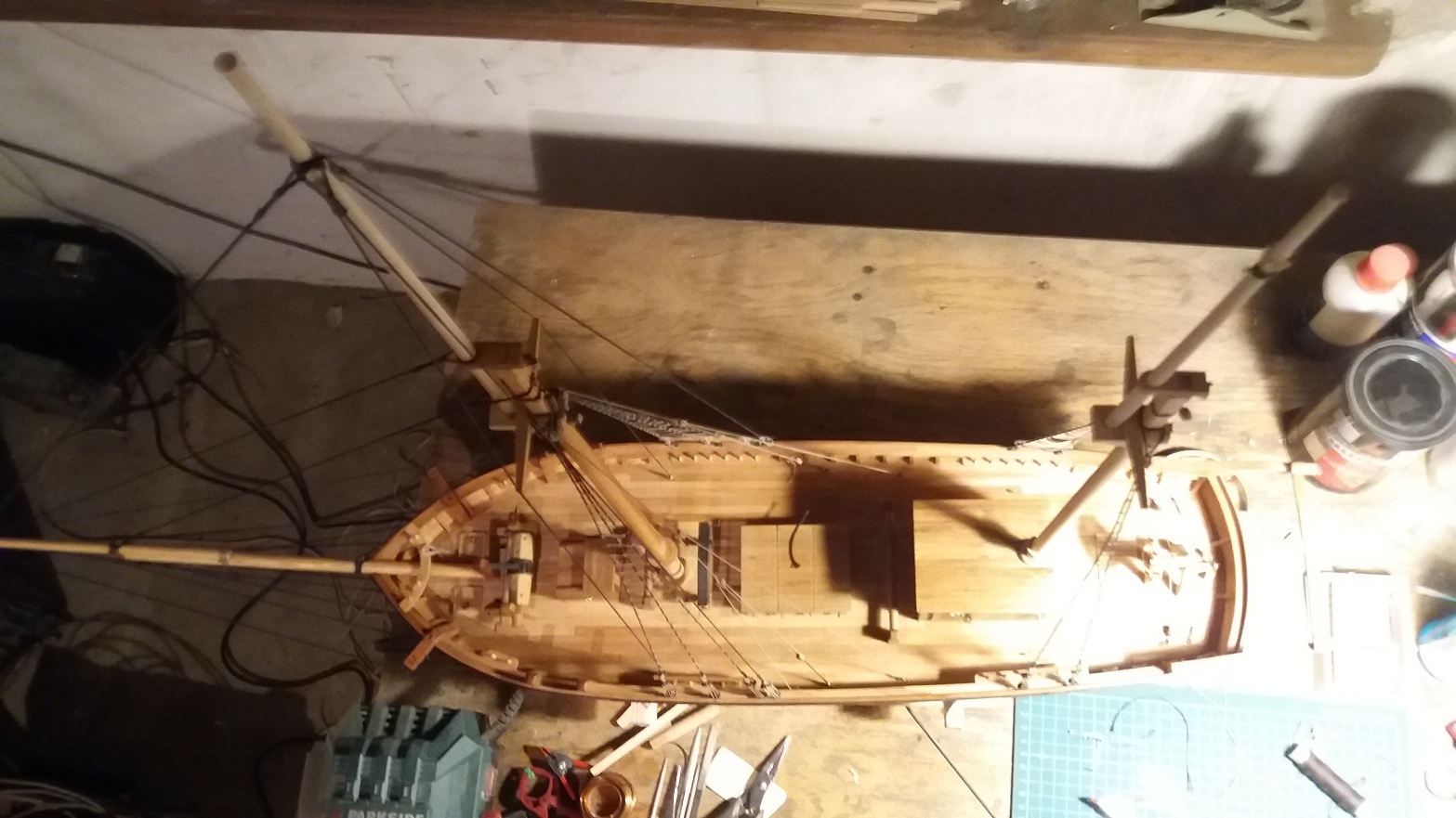 Wiązanie wyblinek ukończone. Obecnie przeniosłem się na grotmaszt i zamocowałem grot stengę.