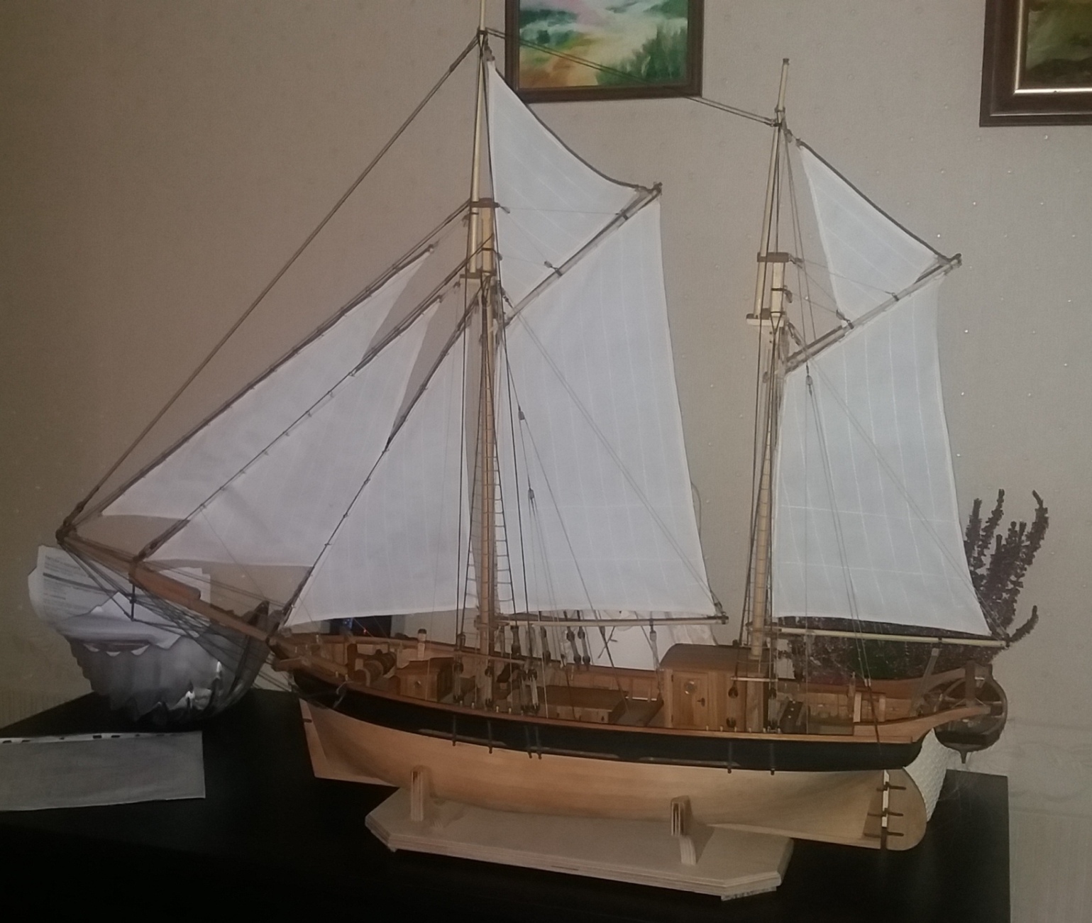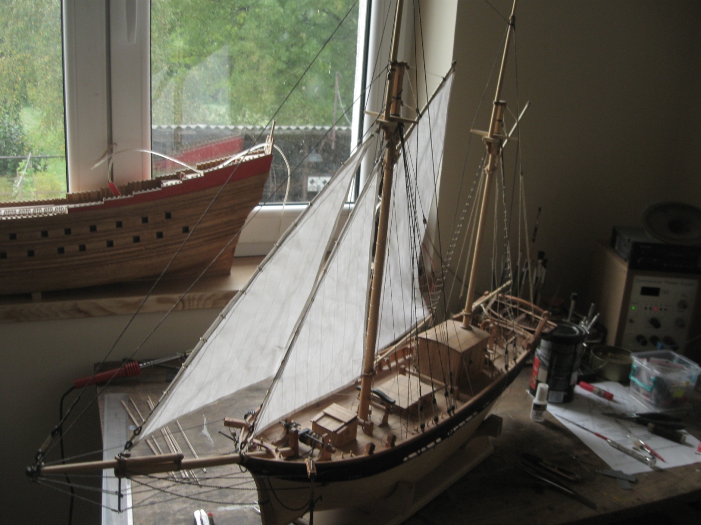 Dziś wieczorem odbyło się wodowanie galeasa K&M, była siostra ze szwagrem. Nota bene to ona uszyła mi żagle, przynieśli ze sobą nawet pękatą buteleczkę pigwówki - więc pływaj po morzach i oceanach.