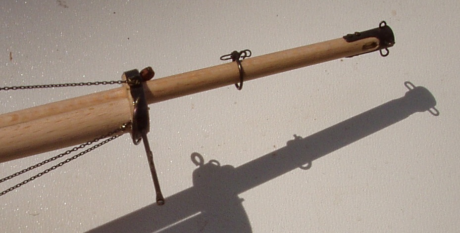 Witam. Tak jak zapowiedziałem przystąpiłem do wykonania okuć bukszprytu w tym do travellera. Wzorując się na rysunkach TomkaA i Adama (Oksala) oraz biorąc pod uwagę niewielką powierzchnię żagli wieszanych na tym sztagu wybrałem wersję prostą bez skomplikowanej talii bloczków. Traveller będzie się poruszał do przodu przez ukryty w stendze podwójny bloczek poprzez przelotki na delfiniaku i mocowany naglem na dziobie. Ruch wsteczny poprzez bloczek zwrotny i dalej jak fał napinający tylko po drugiej stronie bukszprytu. A teraz parę zdjęć. Pozdrawiam Janek.