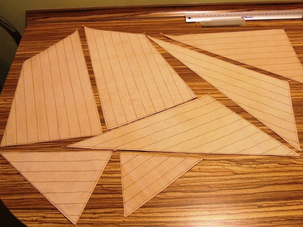 No to tak: ja material na zagle najpierw krochmale, nastepnie prasuje a to dlatego ze na tak przygotowanym materiale ladnie sie rysuje olowkiem bryty. Po wycieciu zagla delikatnie nakladam cieniutka warstwe kleju (nadmiar zbieram po prostu palcami) na liki, i dopiera na tak przygotowany zagiel naklejam liklinke.