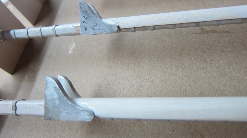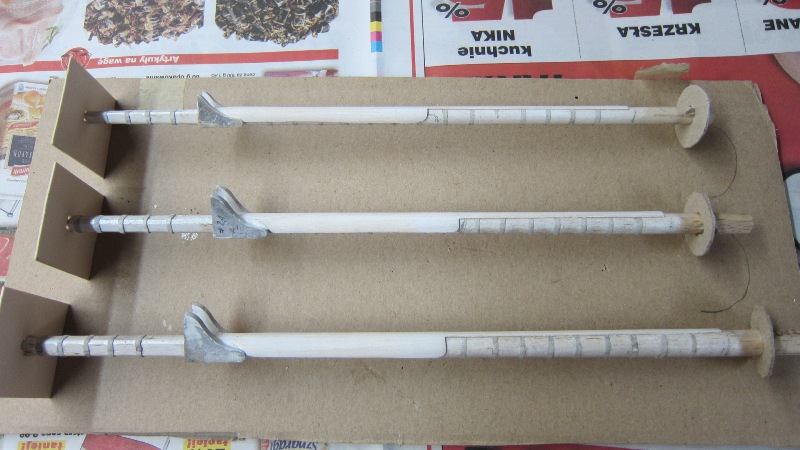 moja stoczniowa stolarnia zrobiła przez lato trochę patyczków. Okazały się one dość pracochłonne, co zajęło sporo czasu i wiele godzin jeszcze pochłoną pozostałe elementy (salingi, bloczki, reje). Chcę mieć prawie kompletne maszty do montażu, bo to mi ułatwi składanie pozostałych elementów takielunku.