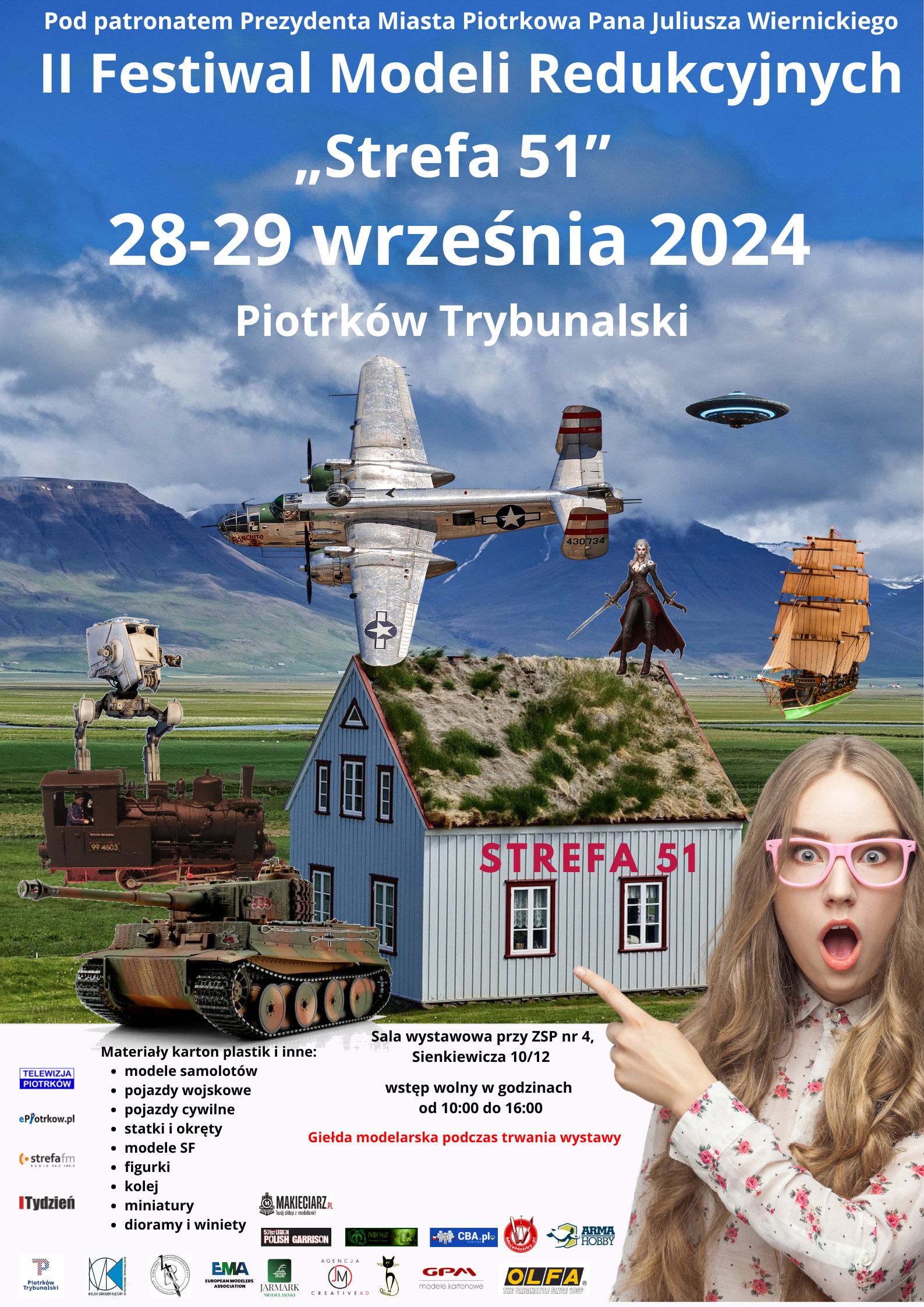 II Festiwal Modeli Redukcyjnych, karton, plastik i inne pod nazwą „Strefa 51” odbędzie się w dniach 28-29 września 2024 w Piotrkowie Trybunalskim zwyczajowo w Hali wystawowej przy ZSP nr 4, ul. Sienkiewicza 10/12, równolegle z Giełdą Modelarską. Zapraszamy przedstawicieli wszystkich opcji modelarstwa redukcyjnego w tym science fiction oraz modelarzy figurkowych. Zgłoszenie należy pobrać ze strony https://ema1.eu/model-expo/strefa-51/ i przesyłać na biuro@ema1.eu.