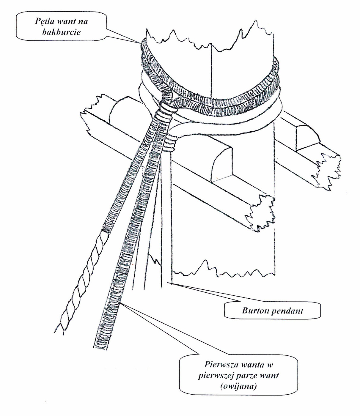 2) Wanty mocowane są parami. W górnej części para want tworzy pętlę, która otacza głowę kolumny masztu; w tej części wanta jest wypełniana i owijana płótnem na odcinku o długości ok. 6 cm (po 3 cm z każdej strony).
