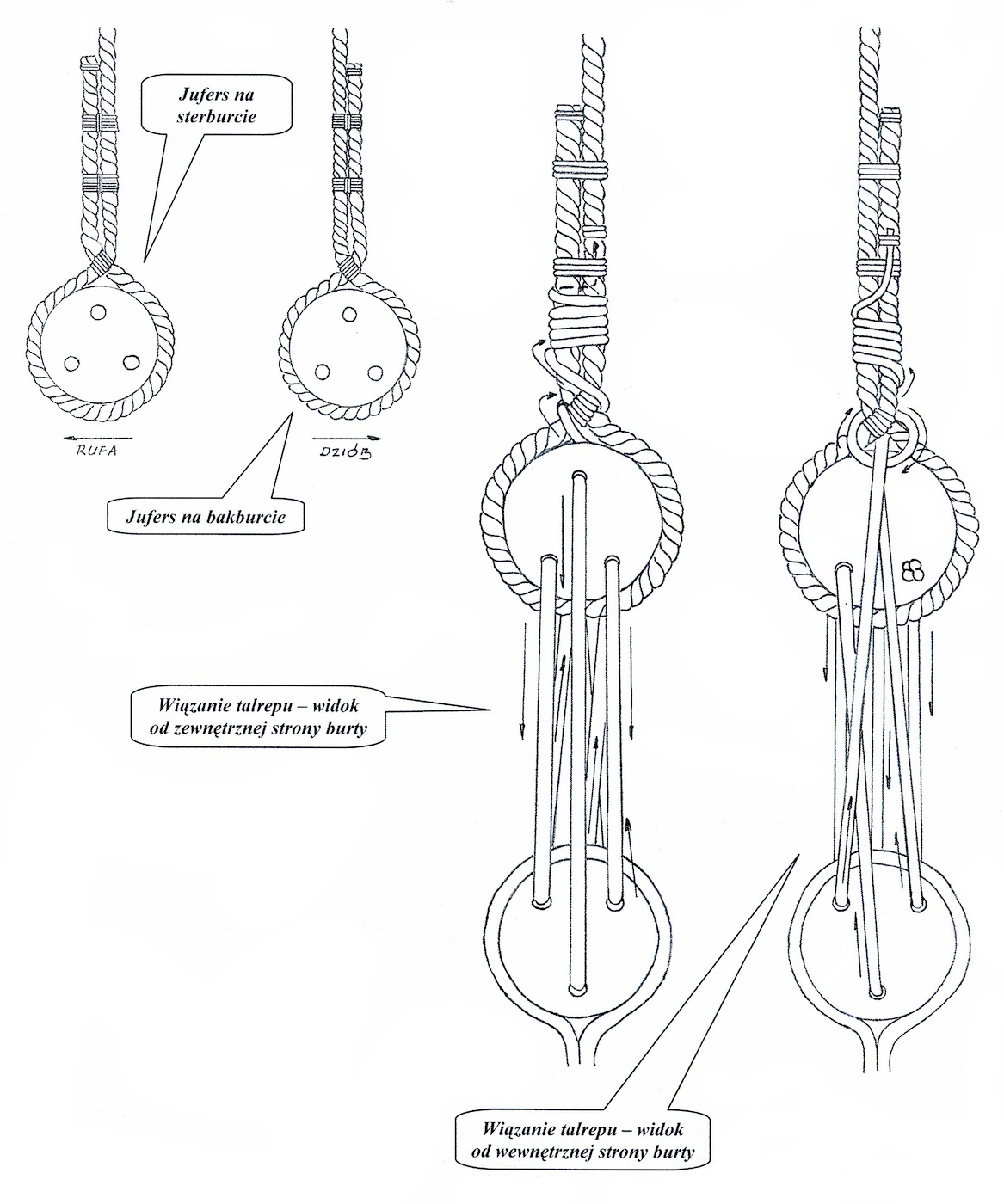 6) W dolnej części każdej wanty mocowany jest jufers; krótszy koniec wanty obiegający jufers, na sterburcie mocowany jest do wanty od strony rufy, a na bakburcie od strony dziobu.