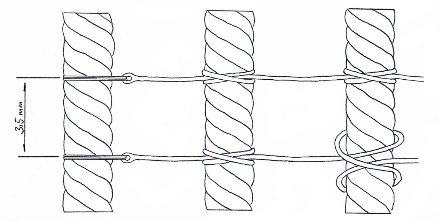 12) Wyblinki (śr. 0,1 mm); wyblinki wiązane są w odstępach co 3,5 mm. Do want mocowane są za pomocą węzła wyblinkowego (clove hitch) z tym, że końcówki wyblinek zakończone są okiem, które do skrajnych want mocowane są za pomocą przewiązu. Sześć wyblinek tuż powyżej jufersów oraz sześć poniżej rozpórki podwantkowej jest mocowanych z pominięciem najbardziej skrajnych want – jednej od strony rufy i jednej od strony dziobu. Wyblinki mocowane są również na podwantkach, bez pomijania którejkolwiek podwantki, w odstępach co 3,5 mm.