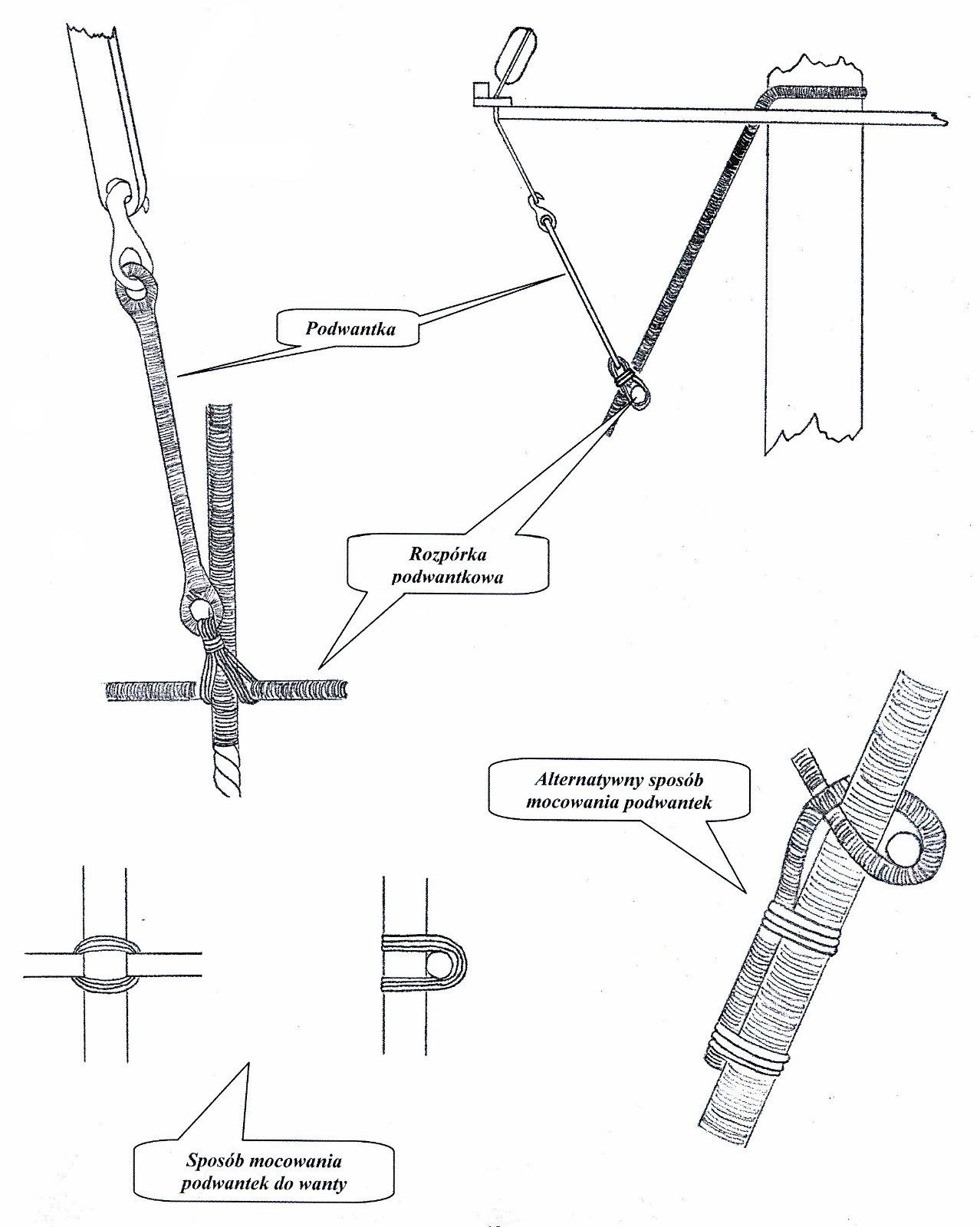 10) Podwantki (śr. 0,5 mm) górny koniec podwantek zakończony jest okiem szplajsowym z kauszą; do tego oka zamocowany jest hak, którym podwantki w górnej części mocowane są do otworu w metalowych obejmach jufersa, przechodzących przez otwory w platformie marsa. Dolny koniec podwantek był mocowany na dwa sposoby - pierwszy polegał na owinięciu podwantki wokół rozpórki podwantkowej oraz wanty i odłożeniu końca podwantki na wancie; bardziej powszechne było zakończenie dolnego końca podwantki okiem szplajsowym, a następnie połączenie oka z rozpórką podwantkową za pomocą przewiązu. Na grocie i foku mocowanych było po sześć podwantek, na bezanie po cztery; podwantki mocowane były począwszy od drugiej wanty (licząc od dziobu).