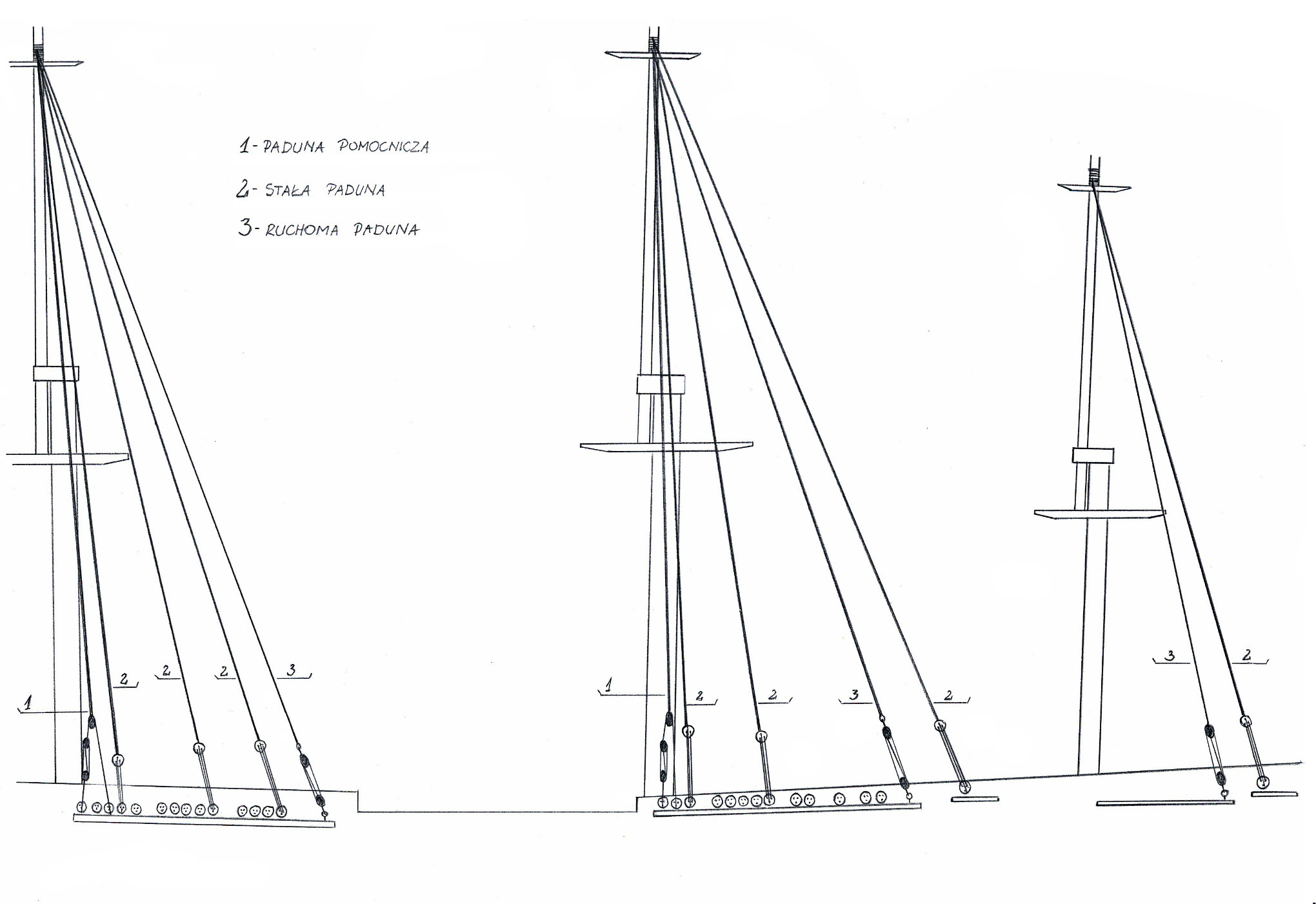 4) Bombramstenpaduny – śr. 0,25 mm dla foka i grota, 0,15 mm dla bezana; na głowie bombramstengi mocowane są za pomocą oka szplajsowego, w dolnej części paduny znajduje się oko z kauszą mocowane za pomocą przewiązu do oka przytwierdzonego na końcu ławy wantowej foka oraz na końcu małej ławy grota i bezana.