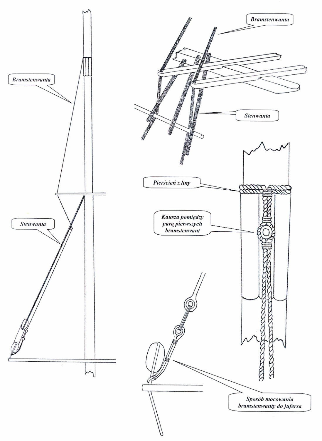 5) Bramstenwanty są mocowane przewiązem do pierwszej, trzeciej i piątej obejmy jufersa (na foku i grocie) oraz do pierwszej i trzeciej na bezanie.