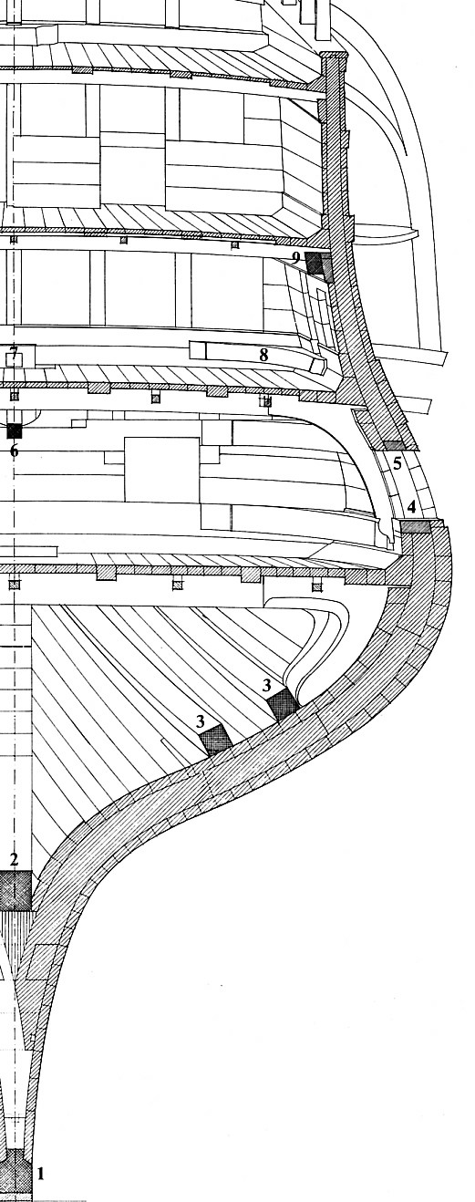 Od poziomej osi centralnej modelu e, prostopadle do niej biegną podwójnej grubości wręgi (składające sie z dwóch warstw onej ‘kanapki’). Im owe wręgi są bliżej dziobu, tym ich zewnętrzne krawędzie są bardziej ‘skosowane’ (zacienione trójkątne pole u góry wręgi 6) – patrz w.w obłość kadłuba. Aby zaoszczędzić na materiale – i mniej skosować (drewno dębowe wówczas było bardzo drogie) oraz wzmocnić całość konstrukcji, wręgi najbardziej dziobowe i rufowe ustawiano juz nie prostopadle do długiej osi kadłuba, ale pod coraz bardziej ostrym kątem, wręgi pochylone, tzw. (ang.) cant frames – jak to widać na przykładzie wręgi nr. 4 na rys.