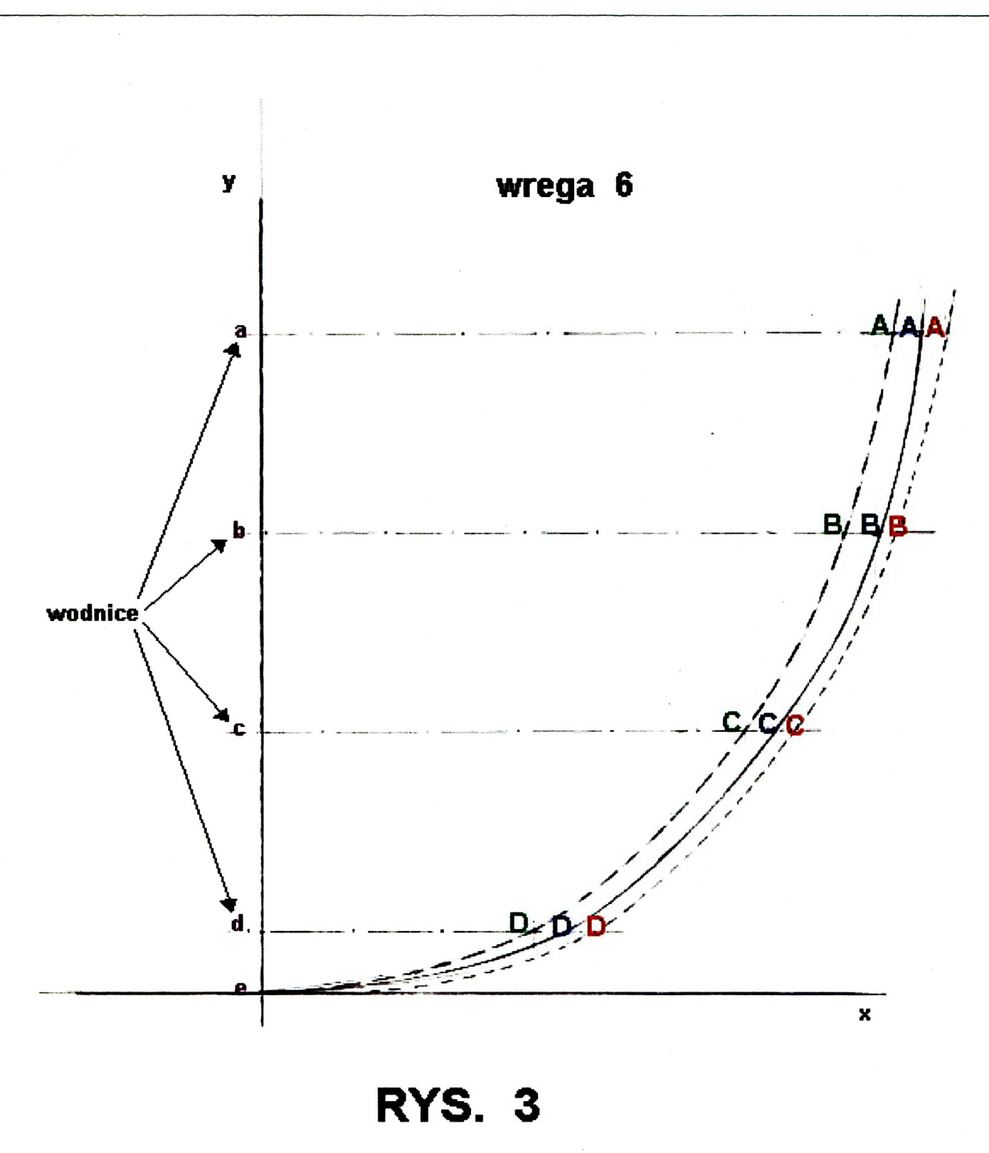 Widać też tu poziomo biegnące, równolegle do osi x linie – w/w wodnice a, b, c, d i e – ta ostatnia jednocześnie jest osia x.