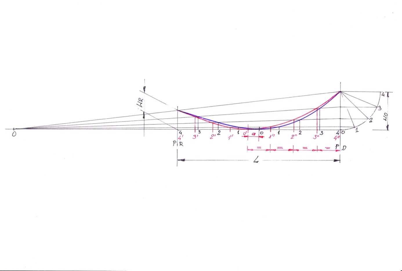 4. Punkty pośrednie wykonujemy wg poniższego schematu : dzielimy połowę długości L oraz WD i WR na jednakową ilość odcinków. Punkt 0 ( w połowie L) łączymy z punktami podziału WD i WR. Z punktów na odcinku L/2 wystawiamy prostopadłe. Przecięcia tych dwóch linii wyznaczają nam punktu krzywej wzniosu – rys.3.