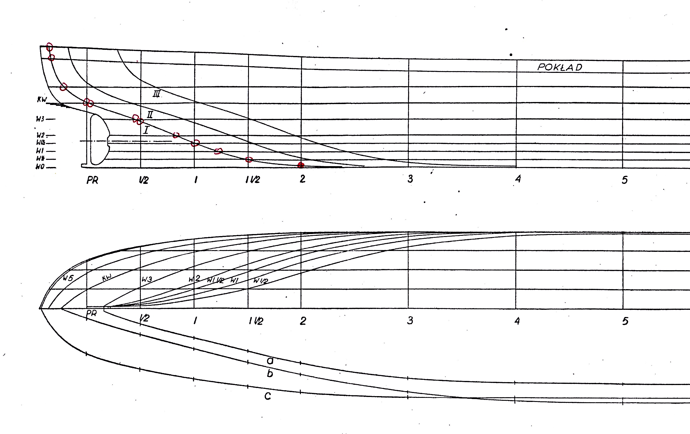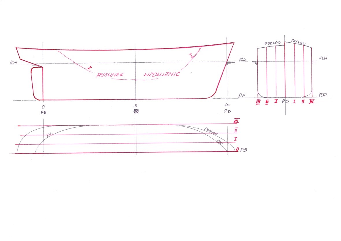Wszystkie linie krzywe na rysunku teoretycznym ze względu na symetryczność kadłuba rysujemy dla połowy statku. Jedyny wyjątek stanowi wręg 5 ( przy podziale LPP na 10 wręgów teoretycznych ) lub 10 ( przy podziale LPP na 20 wręgów teoretycznych ) na rzucie poprzecznym, owrężenia który rysujemy w całości . Pozostałe wręgi rysujemy po połowie zachowując zasadę , że wręgi od strony rufy czyli od 0 do 5 lub 10 rysujemy po lewej stronie rzutu poprzecznego, natomiast wręgi od owrężenia do dziobu czyli od 5lub 10 do 10 lub 20 ( w zależności od przyjętego podziału) rysujemy po prawej stronie rzutu poprzecznego. Krzywe na poszczególnych rzutach opisujemy odpowiednimi dla nich oznaczeniami . Zasadę numerowania podałem we wcześniejszych rozdziałach. Krzywe muszą mieć przebieg płynny i muszą być wzajemnie uzgodnione. W tym celu sprawdzamy współrzędne punktów przecięcia się krzywych na poszczególnych rzutach rysunku teoretycznego linii kadłuba. Dokładność wykonania siatki i linii powinna sięgać 0,1 mm .