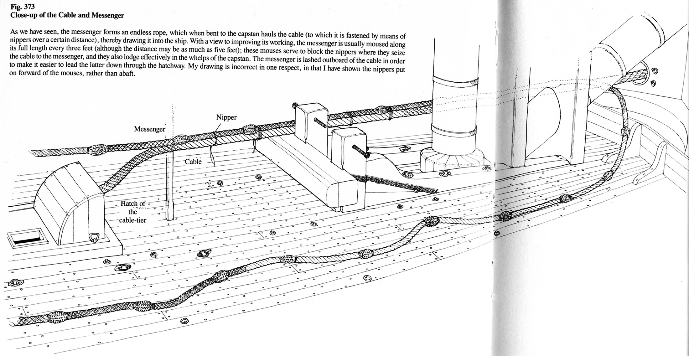 Po drugie: w wiekszych jednostkach, typu np. Victory itp. lina kotwiczna (tzw. cable) byla zbyt gruba i sztywna by moc ja okrecac wokol bebna kabestanu. Do tego byla przewaznie mokra i sliska od glonow, wodorostow i roznych skorupiakow porastajacych na niej, a wiec trudna do manipulowania nia. Zamiast niej uzywano cienszej zwanej messenger, ktora chwilowo przywiazywano do odcinka liny kotwicznej (miedzy hawse holes a kabestanem) krotszymi linkami zwanymi nippers. Do tej funkcji byli wyznaczeni specjalni marynarze nazywani identycznie - nippers albo nipper men. Tuz przy wlazie (hatch to cable tier) dla liny kotwicznej byla usytuowana inna grupa marynarzy ktorzy odwiazywali te ciensze linki, by pozwolic grubej linie kotwicznej wnikac pod poklad, nizej , do specjalnego magazynu gdzie ta lina byla skladowana (cable tier). A lina messenger szla dalej i byla okrecana na bebnie kabestanu. Po kilku okreceniach wokol bebna, jej przeciwlegly bieg wracal ku dziobowi okretu na ksztalt zamknietego okregu i powtarzal swa funkcje... Patrz wyzej.