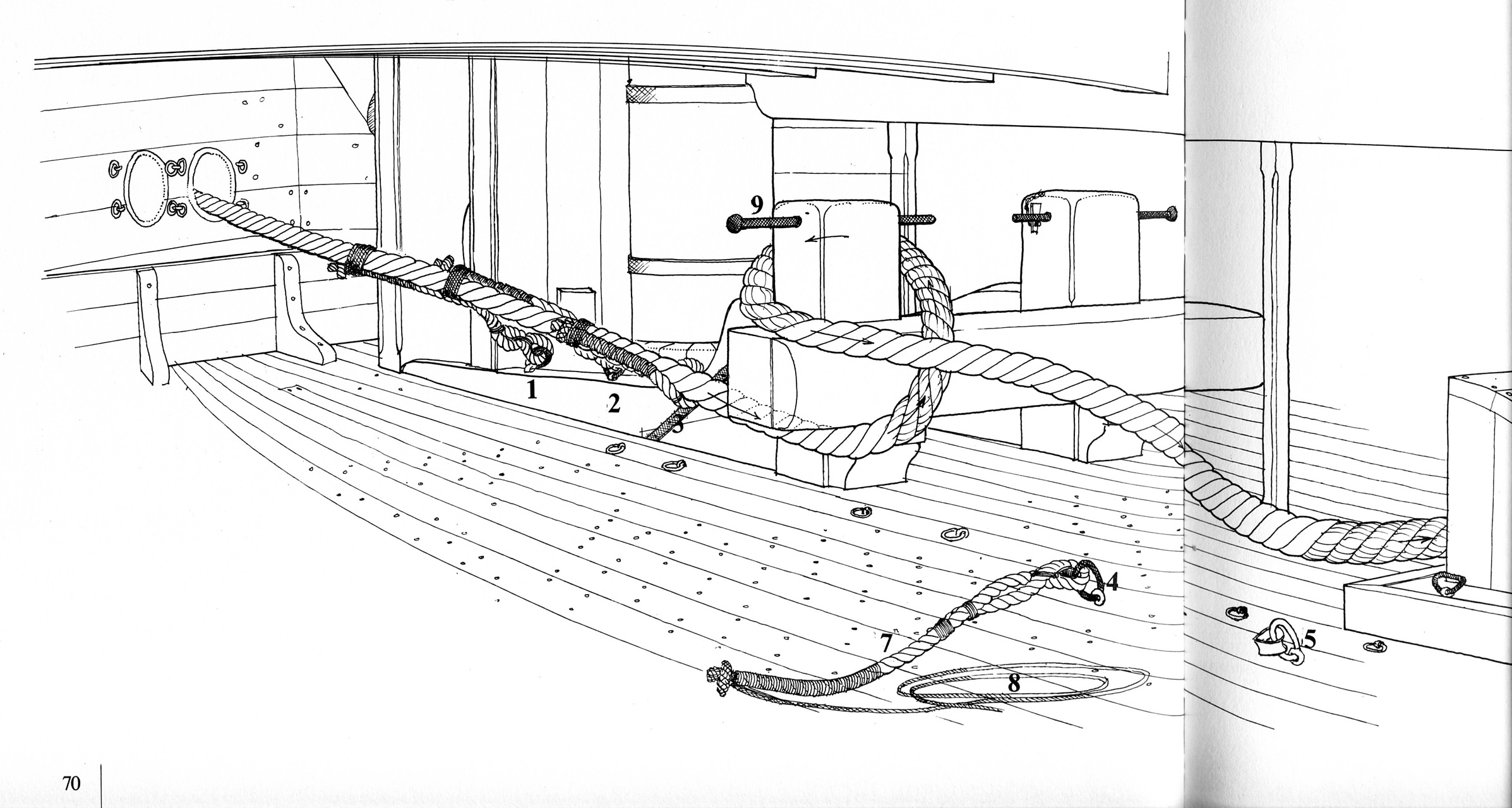 Skan 2 - Sytuacja gdy kotwica jest wyciagnieta z wody - widac line kotwiczna wewnatrz kadluba, okrecona wokol pacholow cable bitts. Nr. 1-4 pokazuja krotsze odcinki lin zwane stoppers przymocowane jednym koncem do pokladu przez zelazne pierscienie, a drugi koniec jest przywiazany do liny kotwicznej, co wraz z okreceniem jej wokol cable bitts stanowi zabezpieczenie przed 'wyslizgnieciem sie' w/w liny i zgubieniem kotwicy.