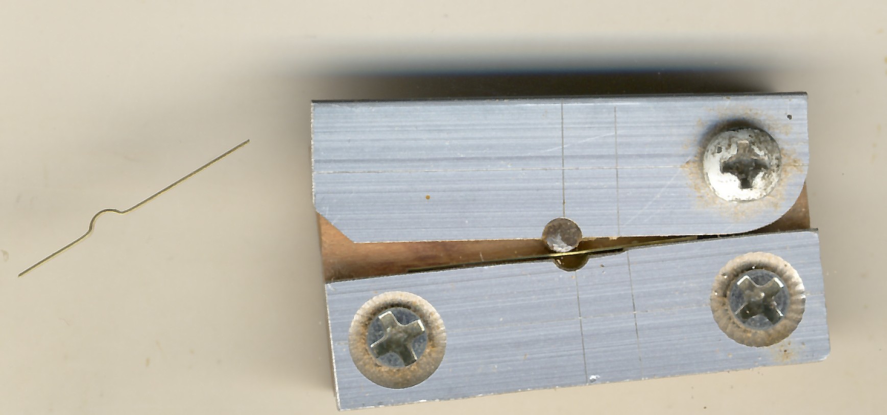 Ja swoje "okucia" zrobilem dla mego Francuza, najpierw przygotowujac taki jig (ustrojstwo) z walajacego sie po katach kawalka drewna i dwoch kawalkow aluminiowego plaskownika. Kawalki te zacisnalem w imadle i w miejscu ich styku wywiercilem otwor o grubosci takiej jakie sa boczne bolce w dzialach dla mego modelu + grubosc blaszki mosieznej. Do jednej polowki tego otworu wkleilem klejem epoxy plasterek z gwozdzia o grubosci w/w bolcow, zostawiwszy druga polowke pusta.