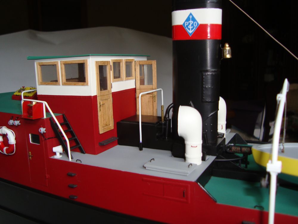 RK w gablocie i przyszedł czas na zakończenie holownika .Sporo czasu zajęło mi mycie modelu bo niezabezpieczony stał na parapecie i muchy go dokumentnie ob.....Wykończenie sprawiło mi sporo przyjemności .Masa różnych drobiazgów nieujętych w dokumentacji .Korzystałem ze starych zdjęć i aktualnych .W czasie ulegał modernizacjom także jest sporo zmian .Wygląda sympatycznie i może ktoś podejmie wyzwanie .Jako pływający nie sprawia frajdy bo nie można poszaleć ale jak się go wyposaży w wytwornicę dymu i moduł dźwiękowy to kto wie .Jeszcze tylko gablotka .Pozdr.R