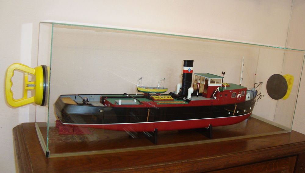 Holowniczek już w gablocie .Mogę spać spokojnie , już go muchy nie ob....Gablotkę skleiłem ze szkła 3mm .Na dole uszczelki od drzwi prysznicowych .Z boku uchwyty na przyssawki do ustawienia gabloty .Obawiałem się ze może mi się wysunąć a tak pewnie trzymałem .Jeszcze tylko tabliczka co ,kto i kiedy dla potomnych .Pozdr.R