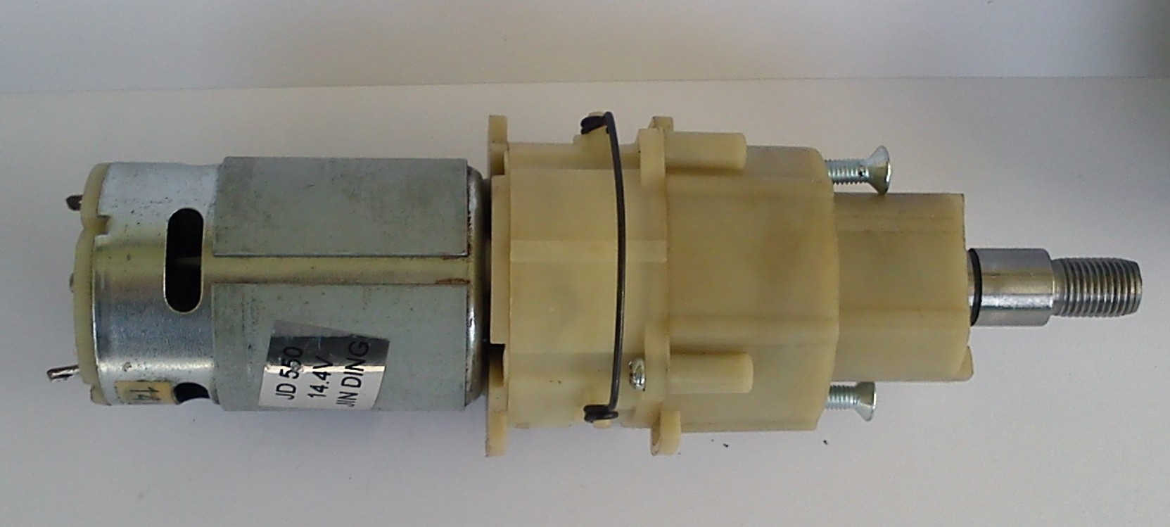 Jest to potrzebny nam gotowy motoreduktor . Rozbiurke zaczynamy od zdjęcia z wałka zabezpieczającego pierściena segera , za pomocą specjalnych szczypiec lub dwuch śrubokrętów . pod spodem są kulki łorzyska oporowego , będą potrzebne . Trzeba całość rozebrać ( trzy lub cztery wkręki na obwodże ) . Całość dokładnie myjemy . w benzynie lub nafcie .