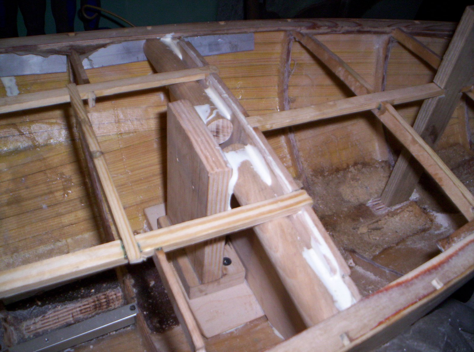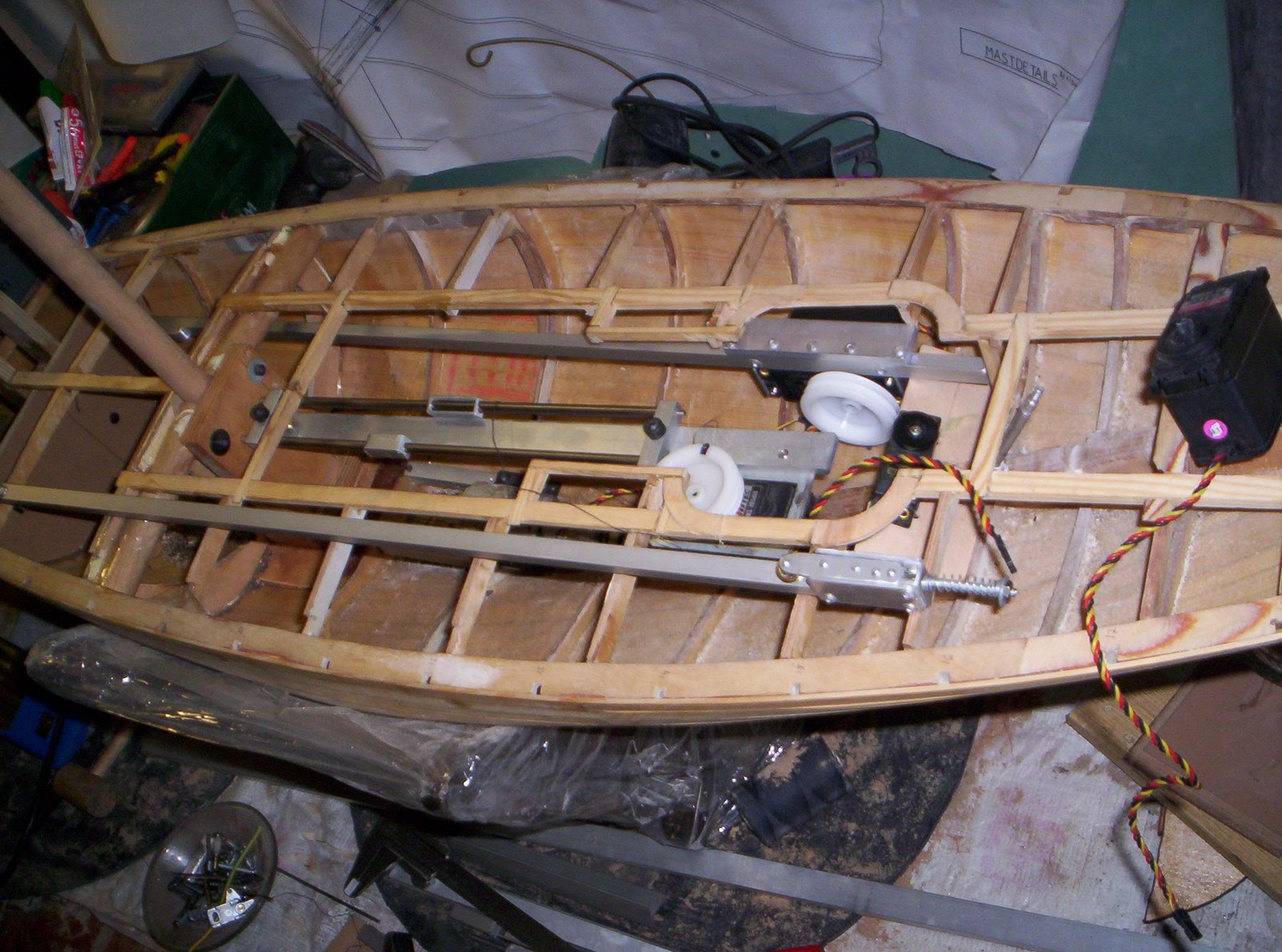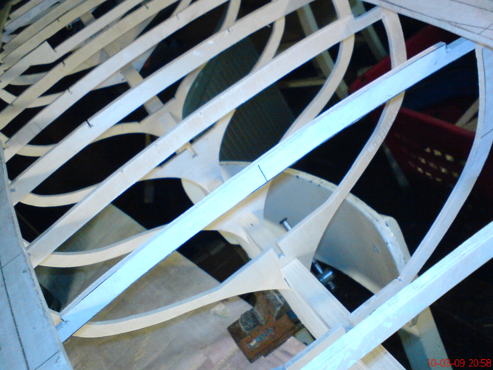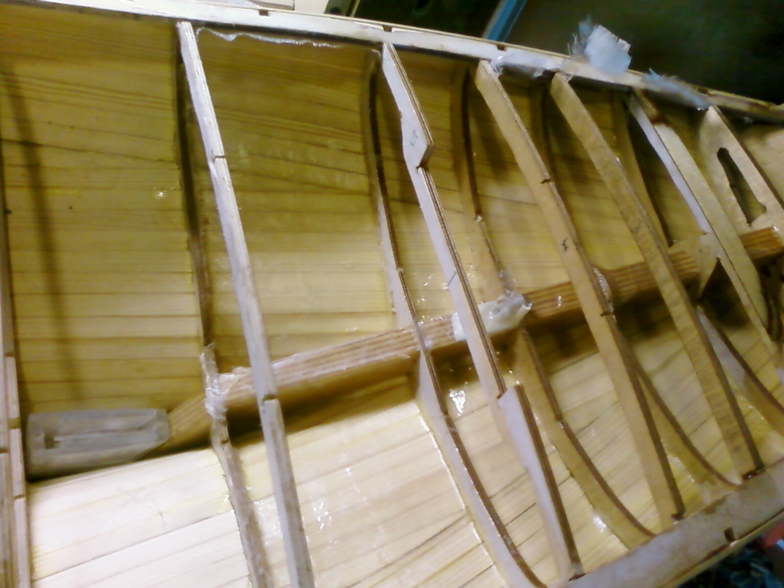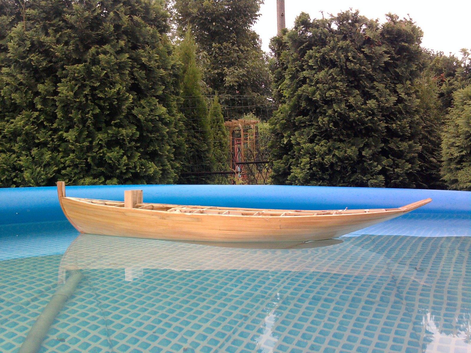 Kolega zrobił model z listew sosnowych ( tzw . słomka ) . Ma to jedną bardzo poważną wade w wypadku modelu pływającego . Drewno pracuje i po jakimś czasie zacznie się wypaczać , pękać . Nawet pokrycie żywicą dwustronnie mało pomaga . Ja już to kiedyś odczułem . Osobiście radził bym obecny model potraktować jak kopyto do zrobienia formy i na niej odbić właściwy model . Ewentualnie potem okleić go fornirem .