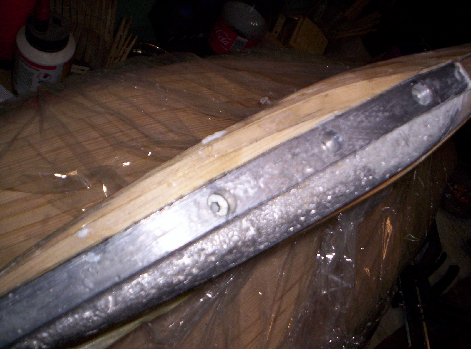 Kolega zrobił model z listew sosnowych ( tzw . słomka ) . Ma to jedną bardzo poważną wade w wypadku modelu pływającego . Drewno pracuje i po jakimś czasie zacznie się wypaczać , pękać . Nawet pokrycie żywicą dwustronnie mało pomaga . Ja już to kiedyś odczułem . Osobiście radził bym obecny model potraktować jak kopyto do zrobienia formy i na niej odbić właściwy model . Ewentualnie potem okleić go fornirem .