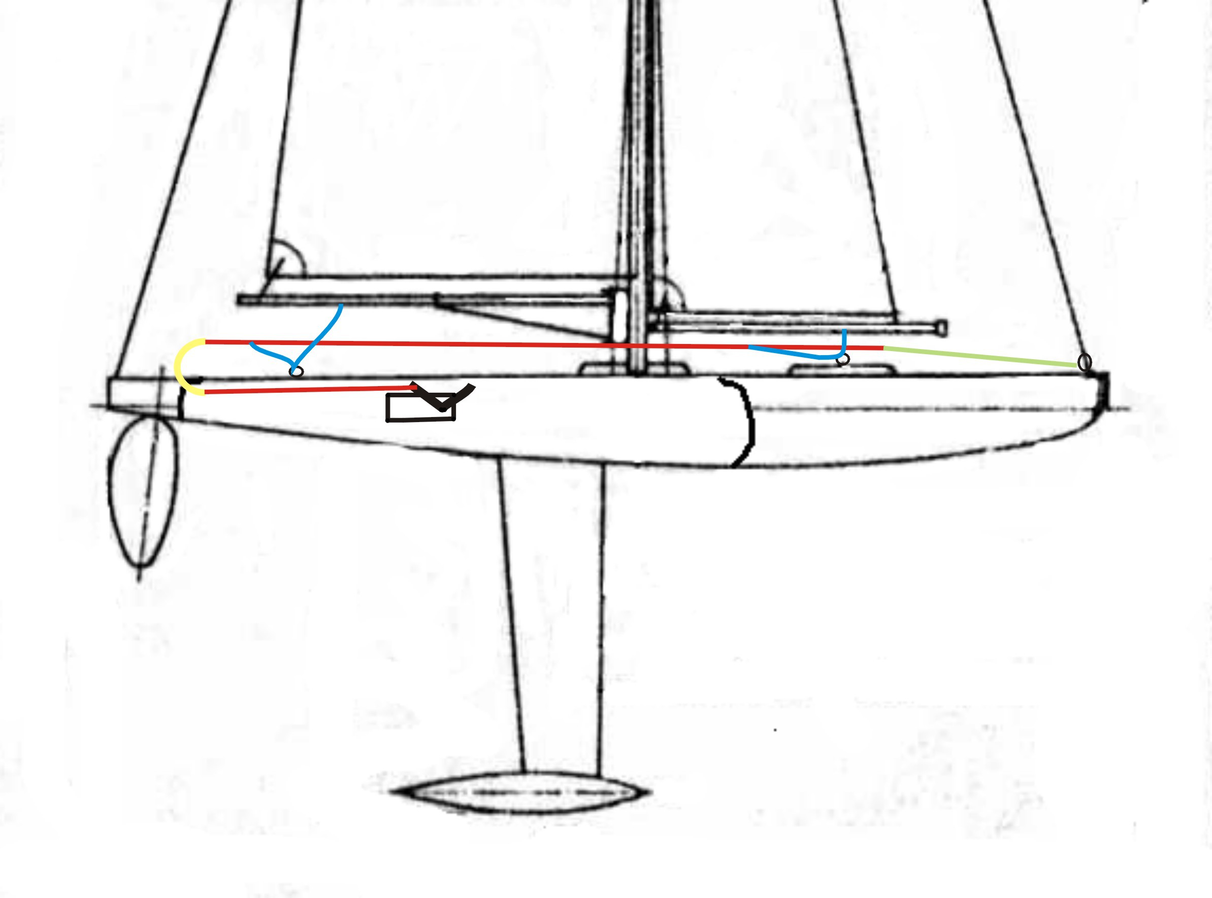 Ja osobiście widzę inny problem . Sądząc z opisu będze to model szkunera i to stosunkowo małego , kolega chce zastosować takie połączenia szotów ;