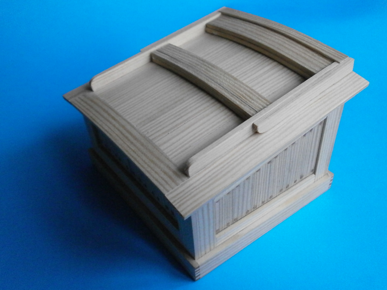 Kolega zrobił model z listew sosnowych ( tzw . słomka ) . Ma to jedną bardzo poważną wade w wypadku modelu pływającego . Drewno pracuje i po jakimś czasie zacznie się wypaczać , pękać . Nawet pokrycie żywicą dwustronnie mało pomaga . Ja już to kiedyś odczułem . Osobiście radził bym obecny model potraktować jak kopyto do zrobienia formy i na niej odbić właściwy model . Ewentualnie potem okleić go fornirem .