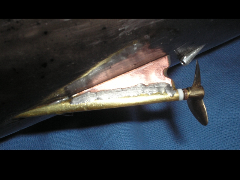 Po pierwsze, strasznie toporna oś steru, w zupełności wystarczyło by 2 lub 3 mm ale stalowa. Zbędny jest też ten pierścień segera. A jak to wszystko zmontujesz to bez lutownicy nie będziesz mógł zdemontować ani steru, ani wału napędowego. Zamiast tego orczyka z miedziowanego kompozytu zastosuj coś takiego: http://www.modele.sklep.pl/pl/Katalog/MATERIALY-DO-BUDOWY-MODELI/78-Akcesoria/Dzwignie-lotek-i-sterow/Orczyk-Steru-Mini-4-mm-jednoramienny.html, wtedy wystarczy zrobić na osi steru lekkie nacięcie (spiłowanie) i całość masz demontowaną. Zamiast pierścienia segera zrób dławicę osi steru takiej długości, żeby sięgała aż do miejsca przykręcenia orczyka. Ster też lepiej zrobić z blaszki stalowej. Najlepszy materiał to wszelkiej maści spachelki czy pace metalowe.