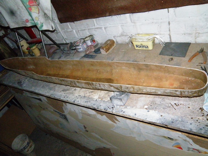 Kadłub posłuży jako kopyto do wykonania formy. Wykonałem go tradycyjnie, wręgi ze sklejki 4mm i podłużnic z listewek 3x3 mm, które ułatwiają późniejsze szlifowanie pianki. Po weszlifowaniu okleiłem cały kadłub papierem na klej do paneli,fajnie wzmacnia powierzchnię, nie ugina się przy szlifowaniu szpachli. Jutro kładę pierwszą warstwę farby więc zobaczę ile jeszcze czeka mnie szlifu. Szpachli użyłem poliestrowej z nowola.