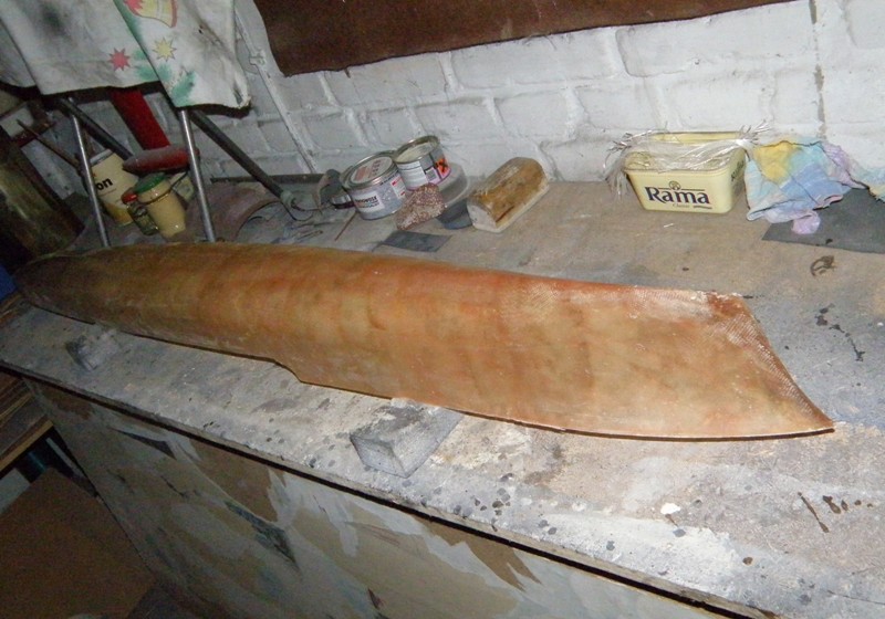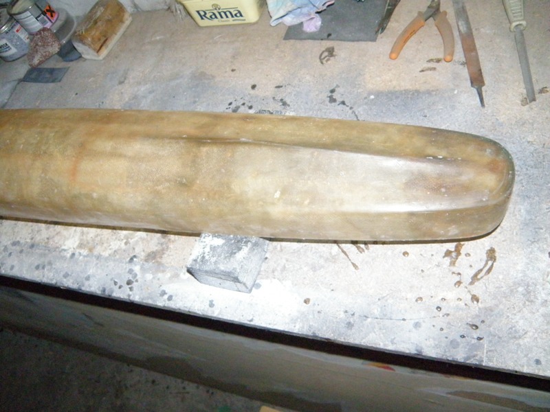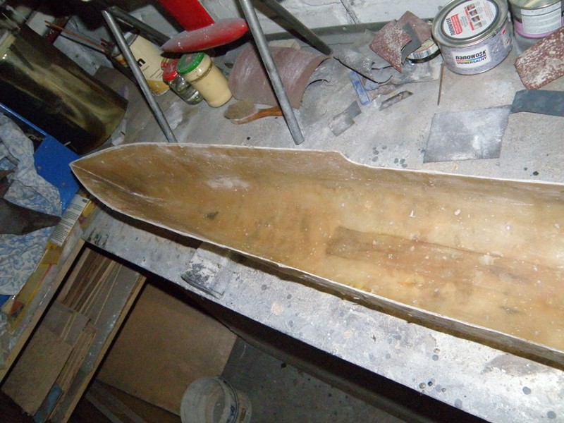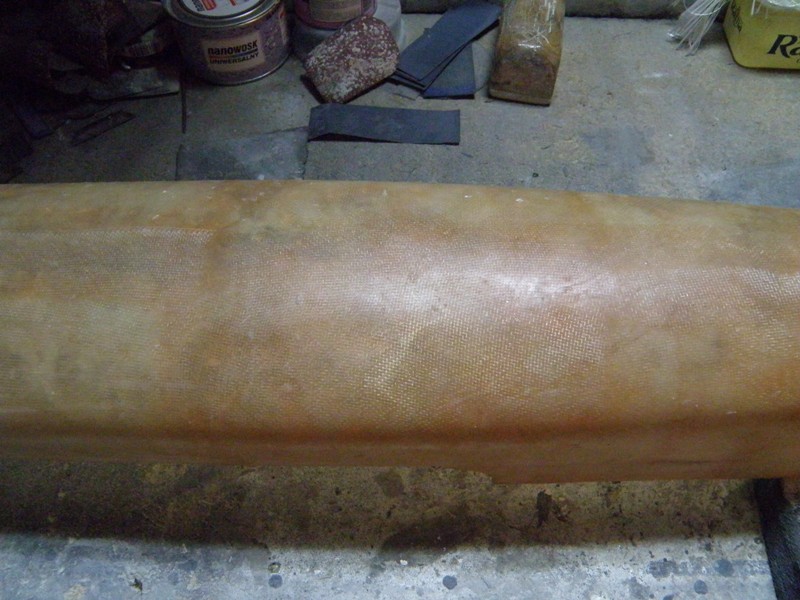 Następna fotka to położony laminat na kopycie- cztery warstwy tkaniny 120g i żywica poliestrowa nowola. Wstępnie obcięte naddatki. Początkowo planowałem wykonać formę połówkową, ale po rozważaniach za i przeciw, stwierdziłem że i tak kadłub powinien wyskoczyć z formy.