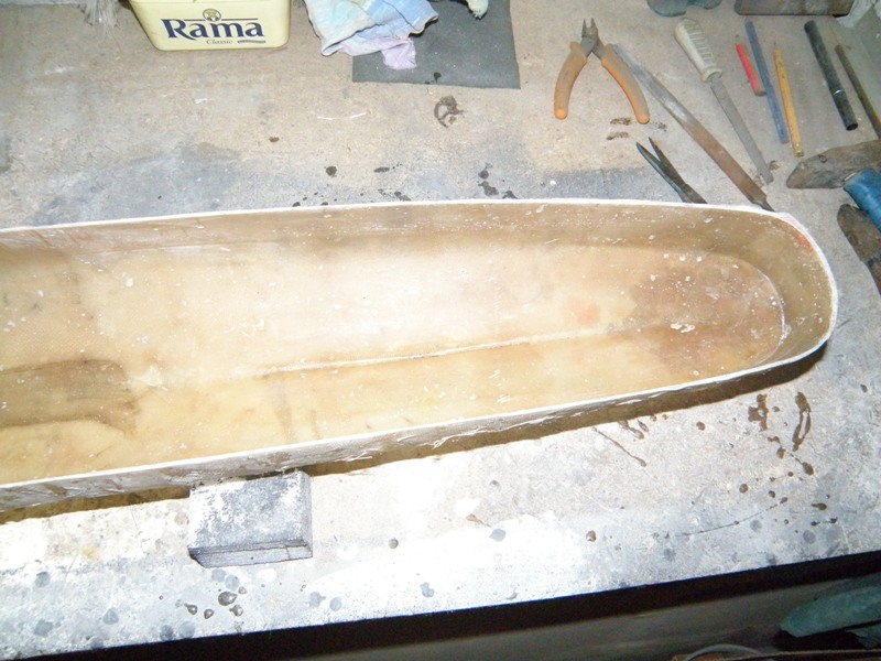Kolejne fotki z moich poczynań. Kadłub wyjęty z formy, krawędzie wstępnie przeszlifowane. Powierzchnia kadłuba wyszła nawet fajnie, nie ma ubytków czy też pęcherzy i nie powinno być problemu z wykończeniem na gotowo. Narazie włożyłem kadłub do formy będzie łatwiej wklejać wzmocnienia i pokładniki.