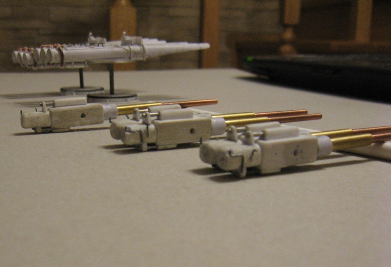 Troszkę coś z doskoku podłubię. Przy wyrzutniach przybyło niewiele drobnicy, ale dlatego że resztę postanowiłem kleić po zagruntowaniu. W między czasie robię kolejne detale, żeby przygotować ich jak najwięcej do malowania podkładem. Postanowiłem zmierzyć się z armatami. Narazie wyglądają troszkę topornie ale wymagają dopieszczenia. Zresztą oceńcie sami.