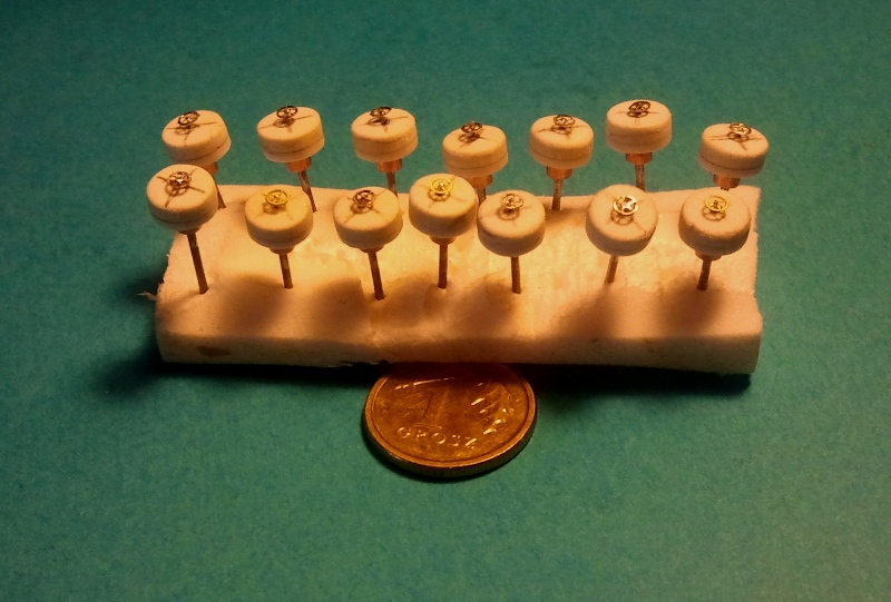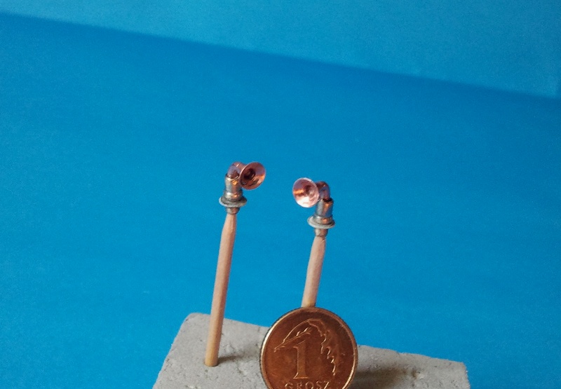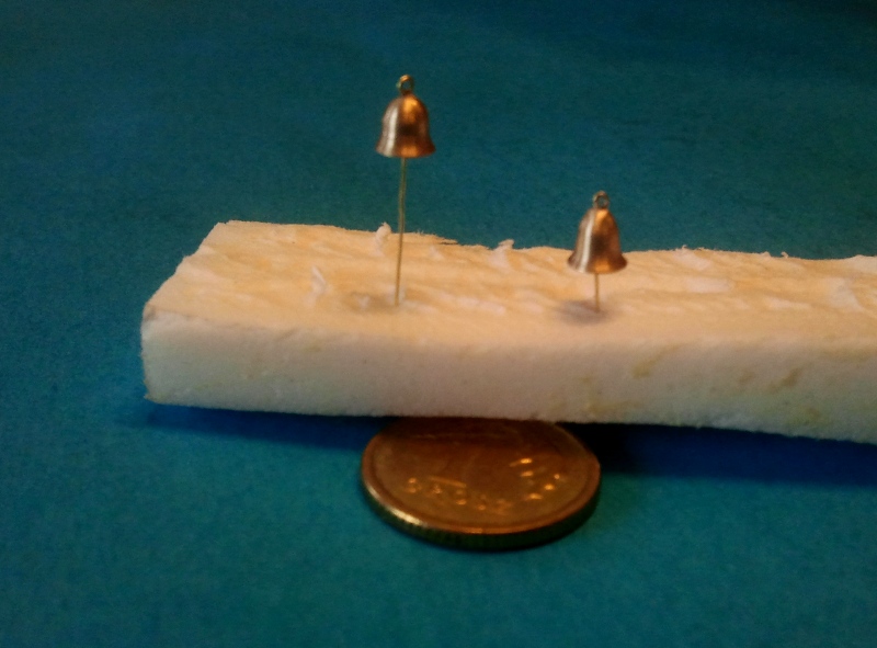 Pomimo małej niedyspozycji coś powstaje, kolejna porcja drobnicy. Tym razem na tapetę poszły pokładowe głowice wentylacyjne i dzwon okrętowy. Dzwon toczony a środek po wstępnym wierceniu, frezowany frezami dentystycznymi.